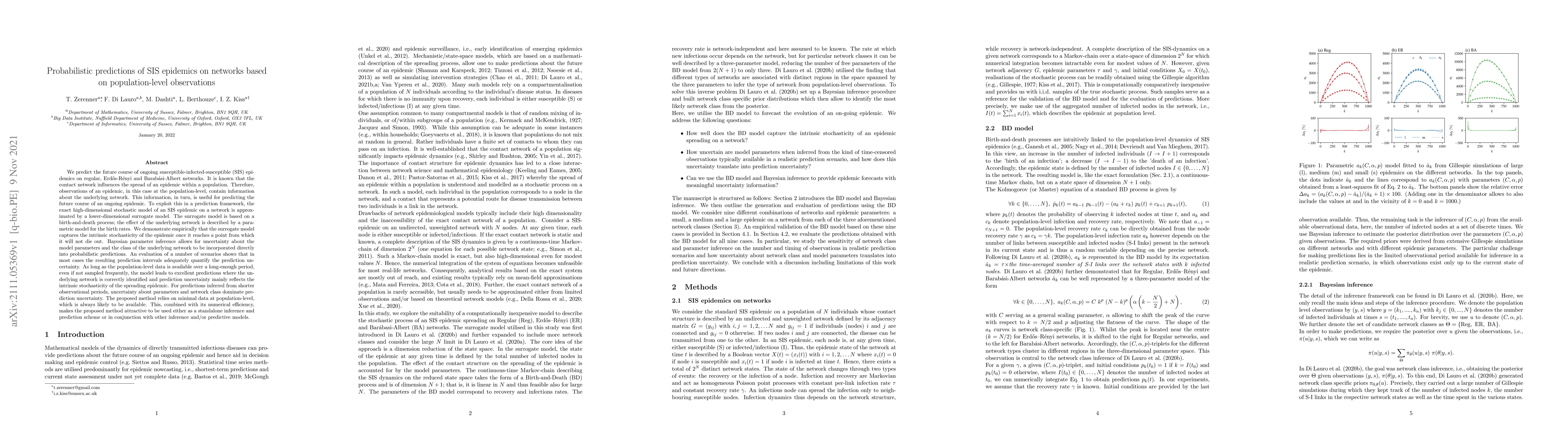This paper proposes a method for probabilistically predicting the future course of SIS epidemics on various network types using population-level observations. It employs a surrogate birth-and-death model to approximate the high-dimensional stochastic epidemic dynamics, allowing for efficient and accurate predictions based on minimal data.