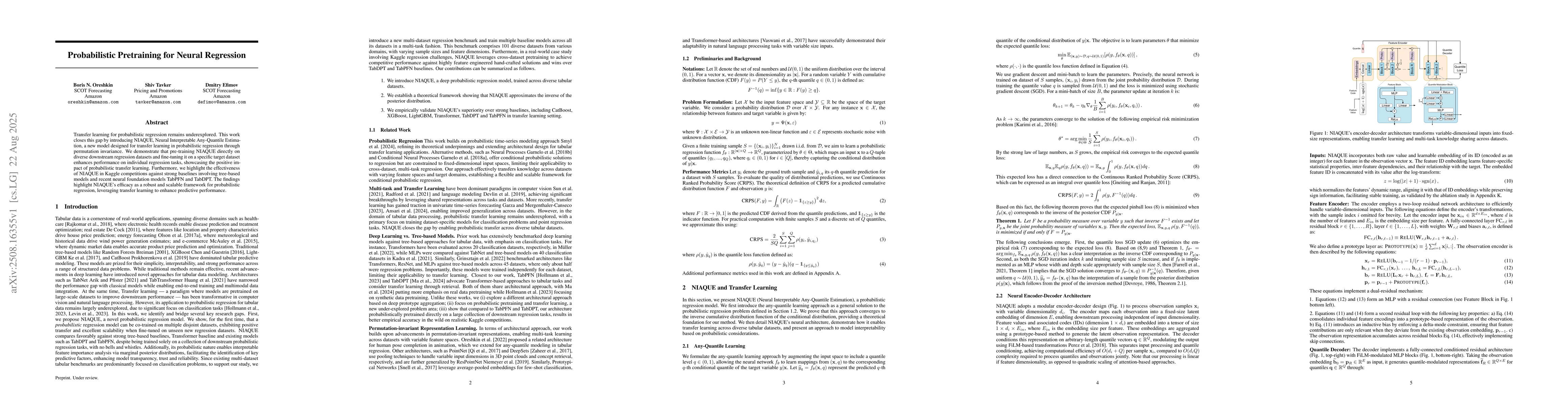 Transfer learning for probabilistic regression remains underexplored. This work closes this gap by introducing NIAQUE, Neural Interpretable Any-Quantile Estimation, a new model designed for transfer learning in probabilistic regression through permutation invariance. We demonstrate that pre-training NIAQUE directly on diverse downstream regression datasets and fine-tuning it on a specific target dataset enhances performance on individual regression tasks, showcasing the positive impact of probabilistic transfer learning. Furthermore, we highlight the effectiveness of NIAQUE in Kaggle competitions against strong baselines involving tree-based models and recent neural foundation models TabPFN and TabDPT. The findings highlight NIAQUE's efficacy as a robust and scalable framework for probabilistic regression, leveraging transfer learning to enhance predictive performance.