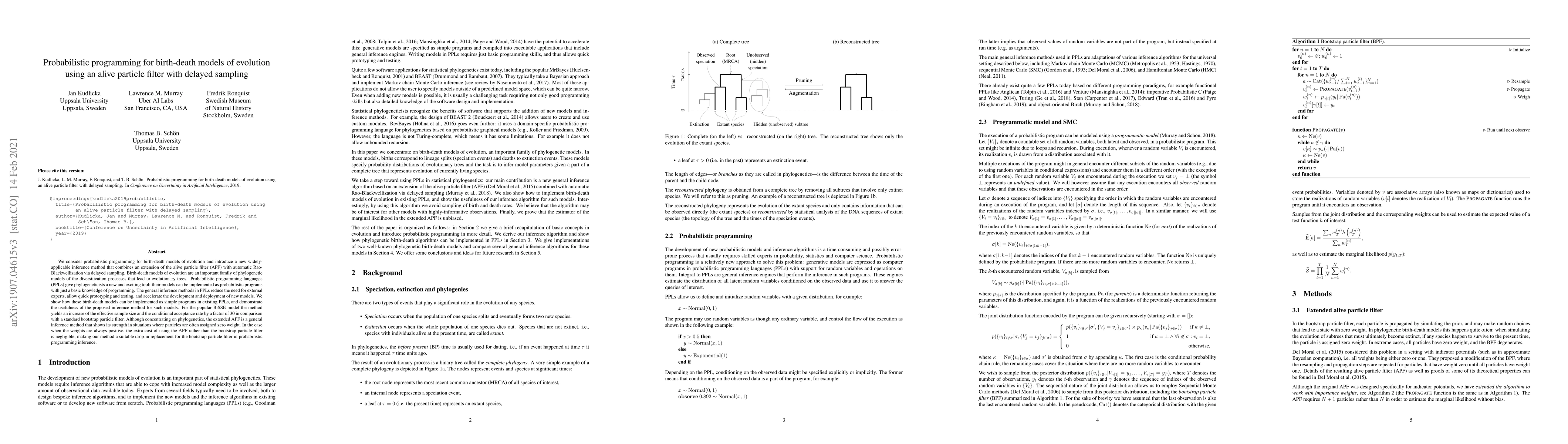 This paper introduces a new inference method for probabilistic programming of birth-death models of evolution, which combines an alive particle filter with delayed sampling, achieving significant improvements over standard methods.