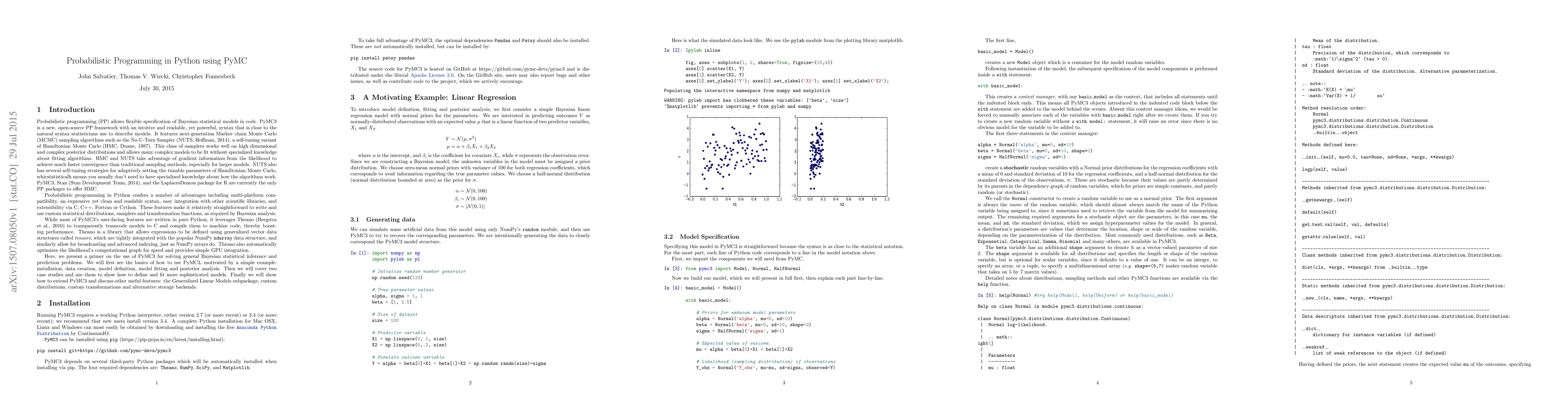 This paper introduces PyMC3, a probabilistic programming framework in Python that facilitates the specification of Bayesian statistical models with intuitive syntax. It leverages advanced MCMC algorithms like NUTS for efficient sampling and offers compatibility, readability, and integration with other scientific libraries.