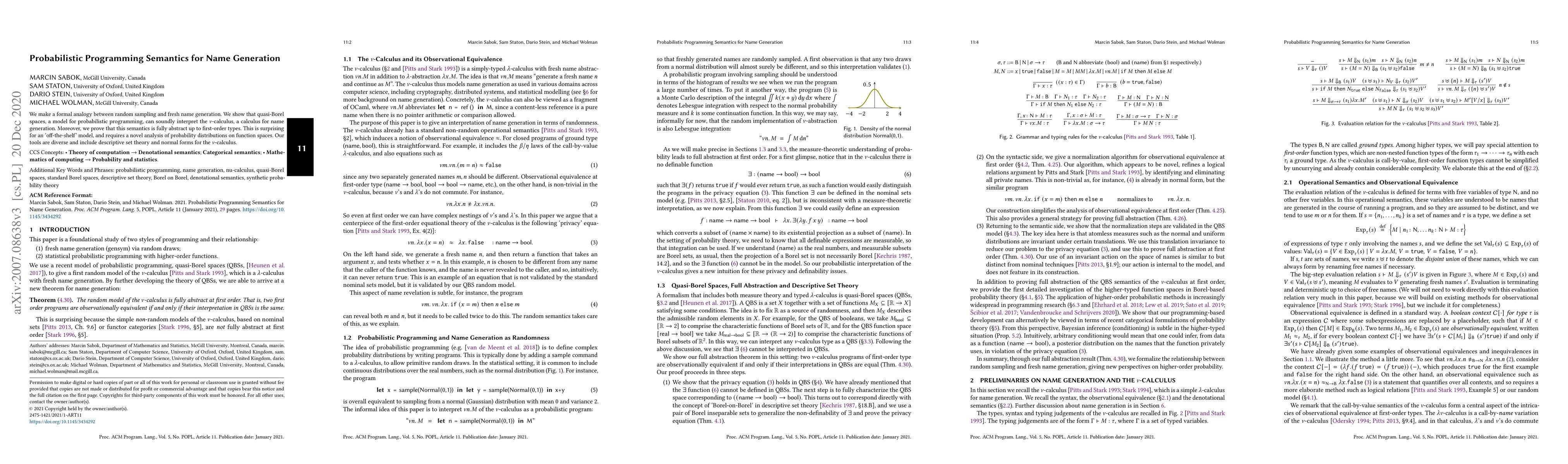 This paper establishes a formal connection between random sampling and fresh name generation, demonstrating that quasi-Borel spaces can interpret Stark's $\nu$-calculus for name generation. It proves the semantics are fully abstract, requiring novel analysis of probability distributions and employing tools from descriptive set theory and normal forms.