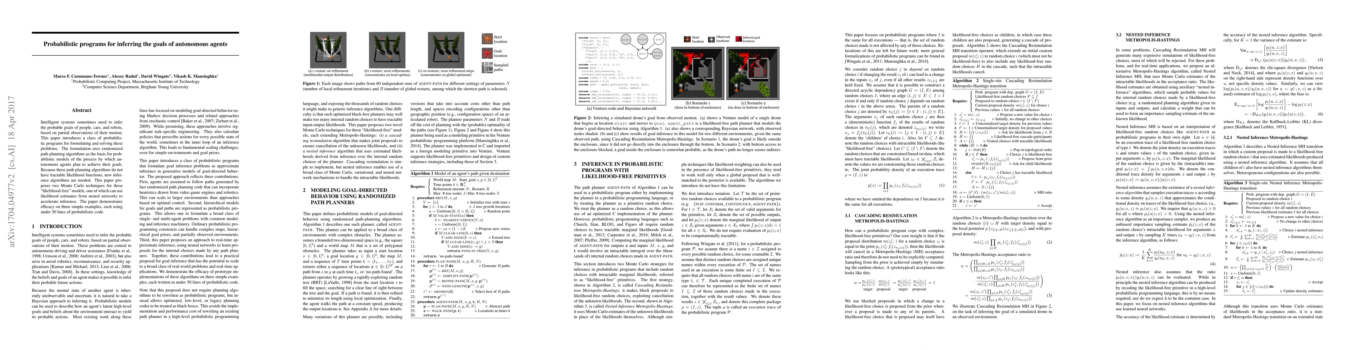 This paper introduces probabilistic programs for inferring the goals of autonomous agents by using randomized path planning algorithms. It proposes two Monte Carlo techniques for inference in "likelihood-free" models, with one leveraging neural networks for faster results, demonstrating effectiveness with concise examples.