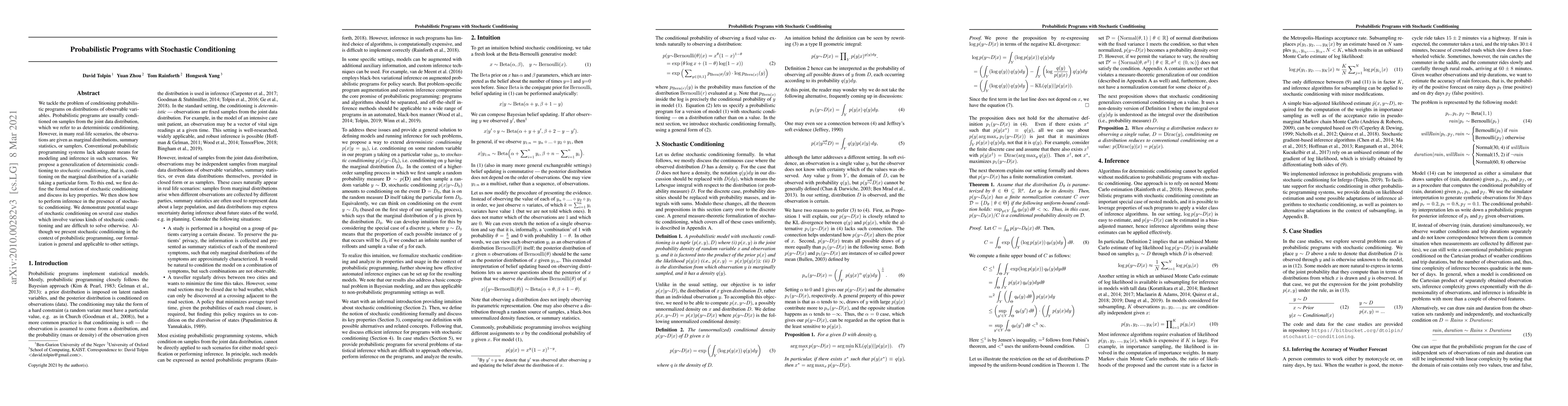 This paper proposes a method for stochastic conditioning in probabilistic programs, enabling conditioning on marginal distributions rather than joint samples. It defines stochastic conditioning, discusses its properties, and demonstrates its application through various case studies, showing its utility in scenarios beyond traditional deterministic conditioning.