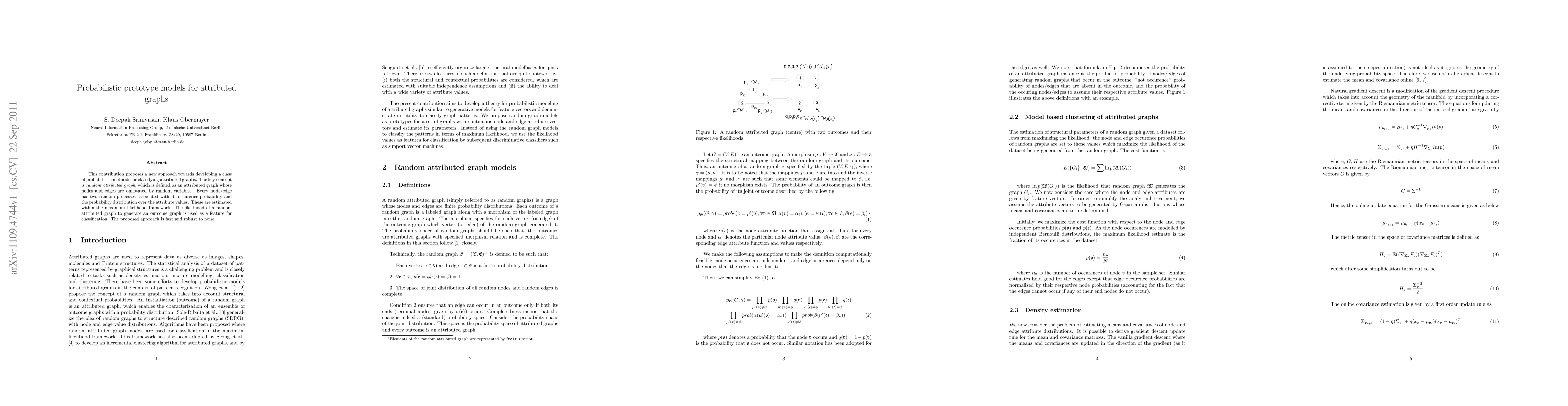 This contribution proposes a new approach towards developing a class of probabilistic methods for classifying attributed graphs. The key concept is random attributed graph, which is defined as an attributed graph whose nodes and edges are annotated by random variables. Every node/edge has two random processes associated with it- occurence probability and the probability distribution over the attribute values. These are estimated within the maximum likelihood framework. The likelihood of a random attributed graph to generate an outcome graph is used as a feature for classification. The proposed approach is fast and robust to noise.