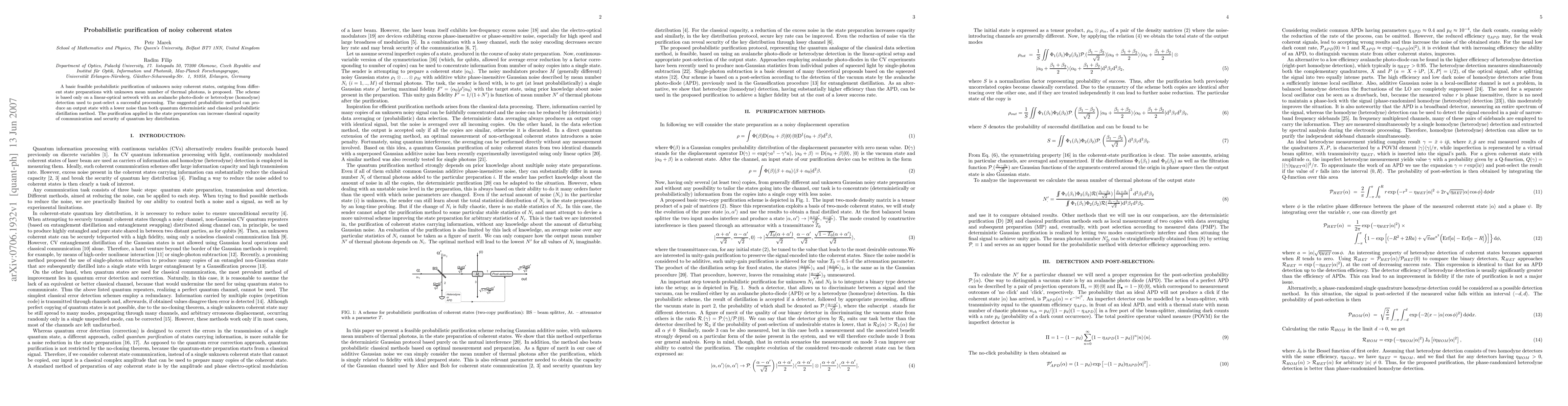 The paper introduces a probabilistic purification scheme for noisy coherent states, utilizing linear-optical networks and post-selection for noise reduction.
