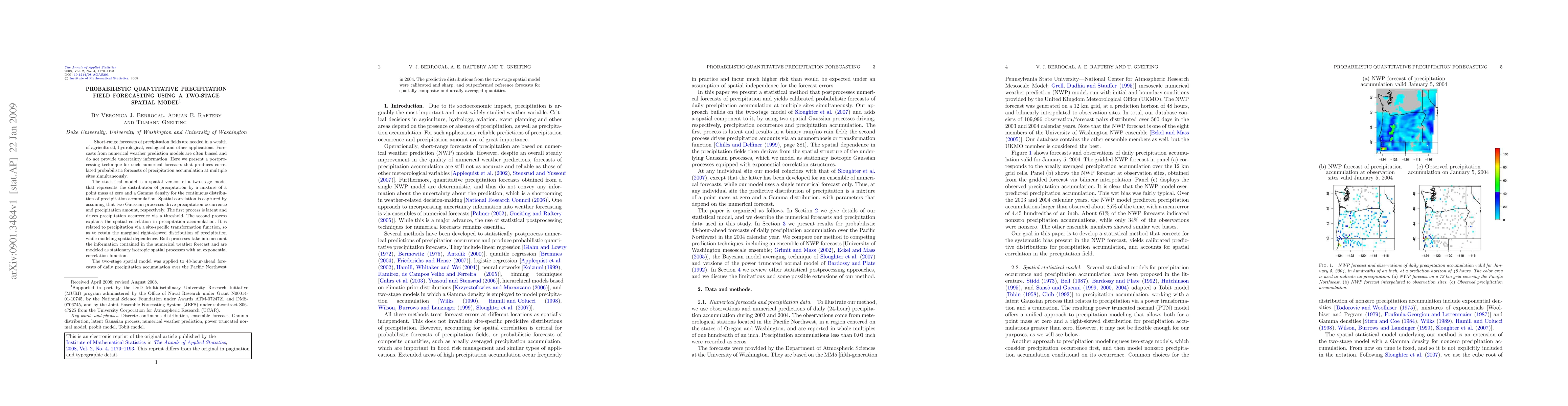 This paper introduces a two-stage spatial model to generate probabilistic precipitation forecasts that incorporate uncertainty, improving upon biased numerical weather predictions. The model combines Gaussian processes to capture spatial correlation and a mixture of point mass and Gamma distribution to represent precipitation accumulation.