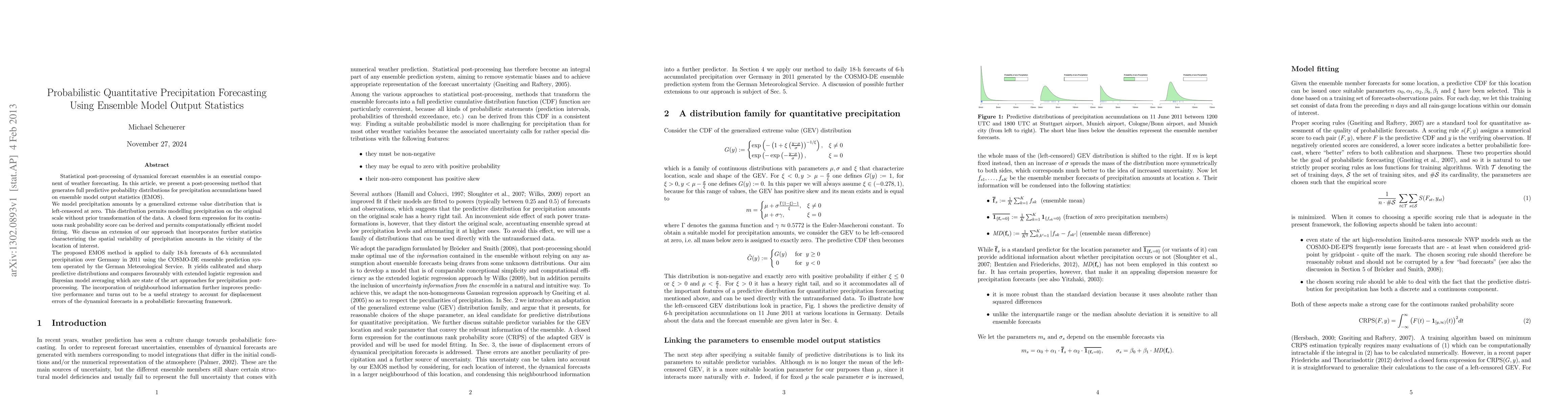 This paper presents an ensemble model output statistics (EMOS) method for probabilistic quantitative precipitation forecasting, using a left-censored generalized extreme value distribution for calibrated and sharp predictive distributions. The approach incorporates spatial variability information to improve performance and outperforms state-of-the-art methods.