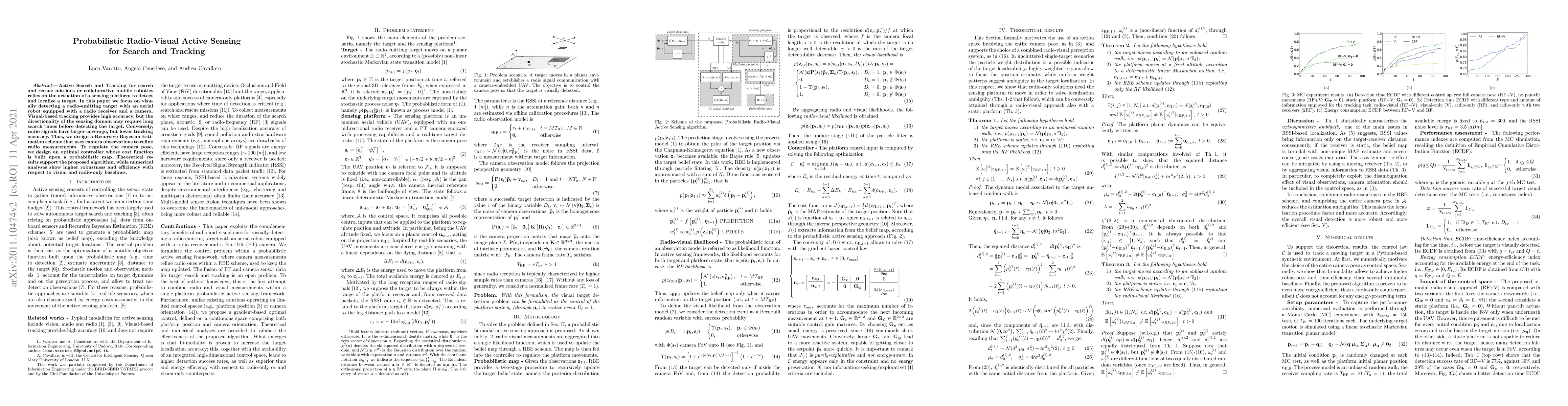 Active Search and Tracking for search and rescue missions or collaborative mobile robotics relies on the actuation of a sensing platform to detect and localize a target. In this paper we focus on visually detecting a radio-emitting target with an aerial robot equipped with a radio receiver and a camera. Visual-based tracking provides high accuracy, but the directionality of the sensing domain may require long search times before detecting the target. Conversely, radio signals have larger coverage, but lower tracking accuracy. Thus, we design a Recursive Bayesian Estimation scheme that uses camera observations to refine radio measurements. To regulate the camera pose, we design an optimal controller whose cost function is built upon a probabilistic map. Theoretical results support the proposed algorithm, while numerical analyses show higher robustness and efficiency with respect to visual and radio-only baselines.