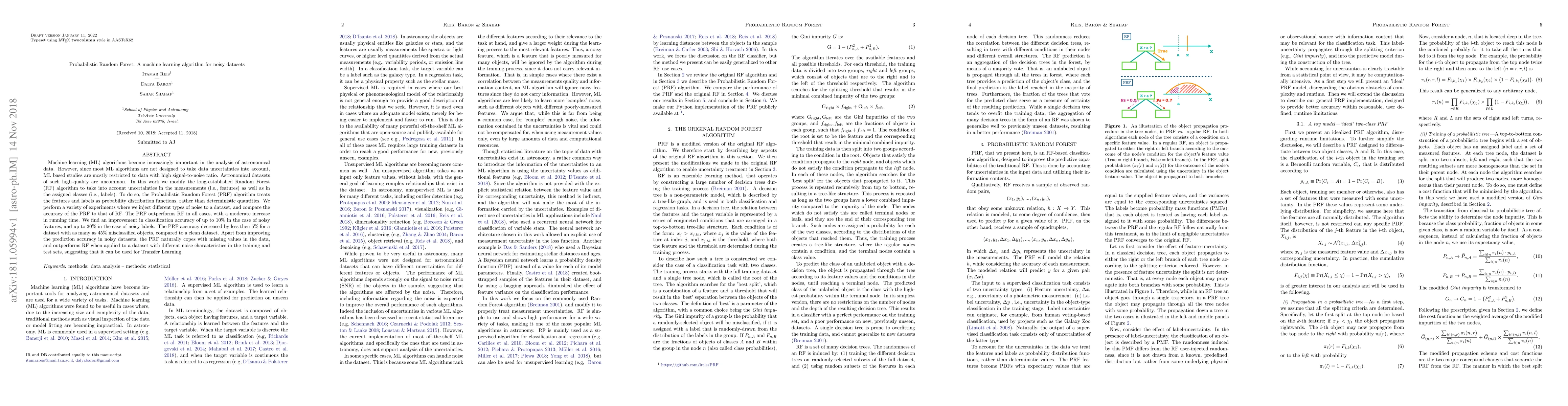 Machine learning (ML) algorithms become increasingly important in the analysis of astronomical data. However, since most ML algorithms are not designed to take data uncertainties into account, ML based studies are mostly restricted to data with high signal-to-noise ratio. Astronomical datasets of such high-quality are uncommon. In this work we modify the long-established Random Forest (RF) algorithm to take into account uncertainties in the measurements (i.e., features) as well as in the assigned classes (i.e., labels). To do so, the Probabilistic Random Forest (PRF) algorithm treats the features and labels as probability distribution functions, rather than deterministic quantities. We perform a variety of experiments where we inject different types of noise to a dataset, and compare the accuracy of the PRF to that of RF. The PRF outperforms RF in all cases, with a moderate increase in running time. We find an improvement in classification accuracy of up to 10% in the case of noisy features, and up to 30% in the case of noisy labels. The PRF accuracy decreased by less then 5% for a dataset with as many as 45% misclassified objects, compared to a clean dataset. Apart from improving the prediction accuracy in noisy datasets, the PRF naturally copes with missing values in the data, and outperforms RF when applied to a dataset with different noise characteristics in the training and test sets, suggesting that it can be used for Transfer Learning.