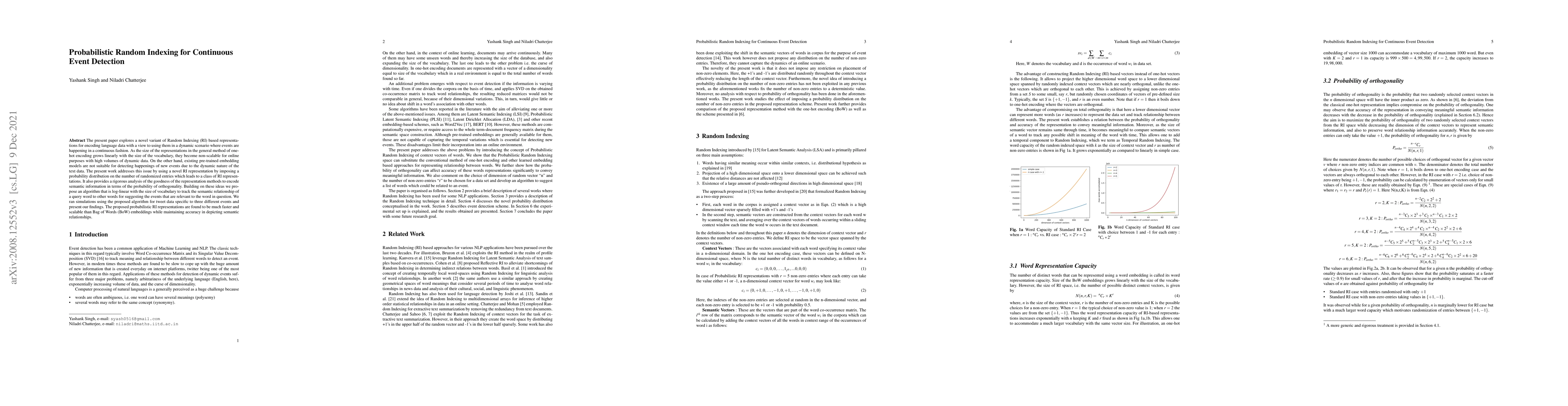 The present paper explores a novel variant of Random Indexing (RI) based representations for encoding language data with a view to using them in a dynamic scenario where events are happening in a continuous fashion. As the size of the representations in the general method of onehot encoding grows linearly with the size of the vocabulary, they become non-scalable for online purposes with high volumes of dynamic data. On the other hand, existing pre-trained embedding models are not suitable for detecting happenings of new events due to the dynamic nature of the text data. The present work addresses this issue by using a novel RI representation by imposing a probability distribution on the number of randomized entries which leads to a class of RI representations. It also provides a rigorous analysis of the goodness of the representation methods to encode semantic information in terms of the probability of orthogonality. Building on these ideas we propose an algorithm that is log-linear with the size of vocabulary to track the semantic relationship of a query word to other words for suggesting the events that are relevant to the word in question. We ran simulations using the proposed algorithm for tweet data specific to three different events and present our findings. The proposed probabilistic RI representations are found to be much faster and scalable than Bag of Words (BoW) embeddings while maintaining accuracy in depicting semantic relationships.
