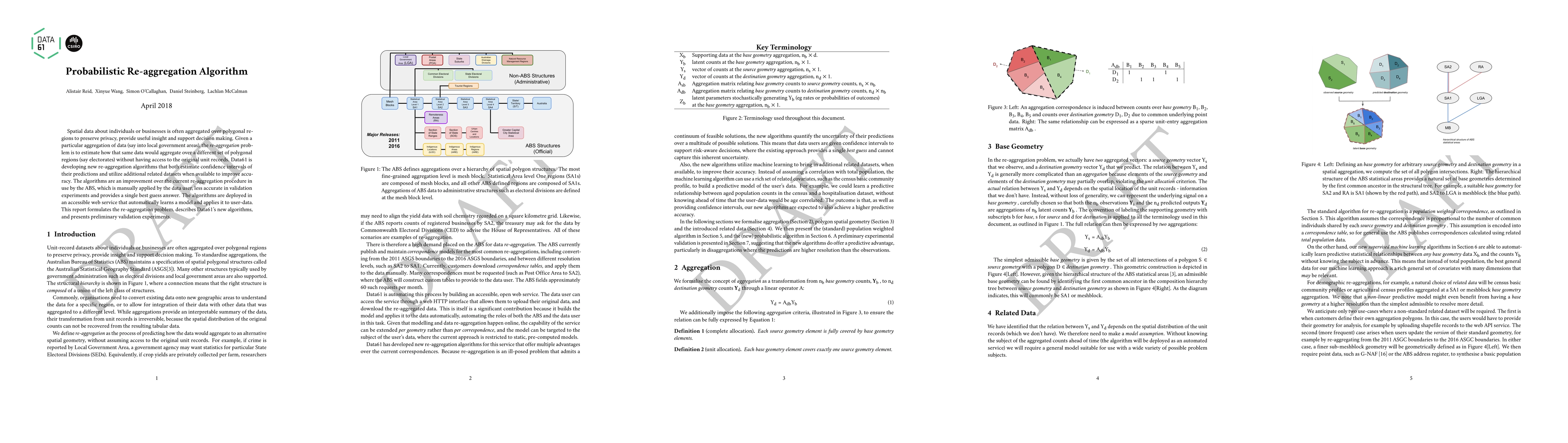 Spatial data about individuals or businesses is often aggregated over polygonal regions to preserve privacy, provide useful insight and support decision making. Given a particular aggregation of data (say into local government areas), the re-aggregation problem is to estimate how that same data would aggregate over a different set of polygonal regions (say electorates) without having access to the original unit records. Data61 is developing new re-aggregation algorithms that both estimate confidence intervals of their predictions and utilize additional related datasets when available to improve accuracy. The algorithms are an improvement over the current re-aggregation procedure in use by the ABS, which is manually applied by the data user, less accurate in validation experiments and provides a single best guess answer. The algorithms are deployed in an accessible web service that automatically learns a model and applies it to user-data. This report formulates the re-aggregation problem, describes Data61's new algorithms, and presents preliminary validation experiments.