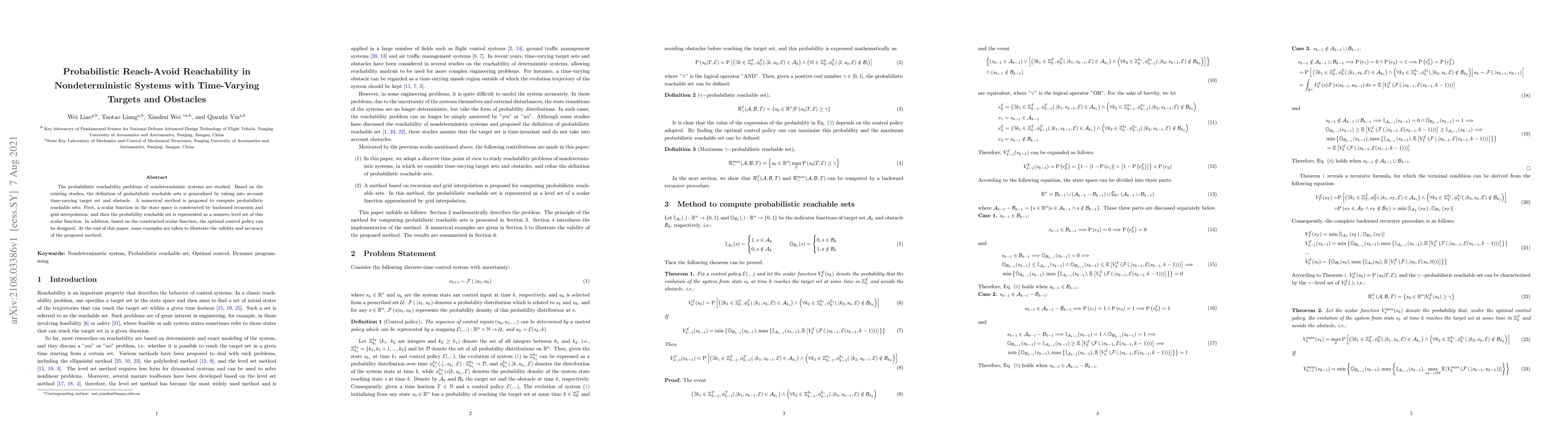 This paper generalizes probabilistic reachability in nondeterministic systems by incorporating time-varying targets and obstacles, and proposes a numerical method to compute probabilistic reachable sets using backward recursion and grid interpolation. The method also enables the design of optimal control policies, validated through examples.