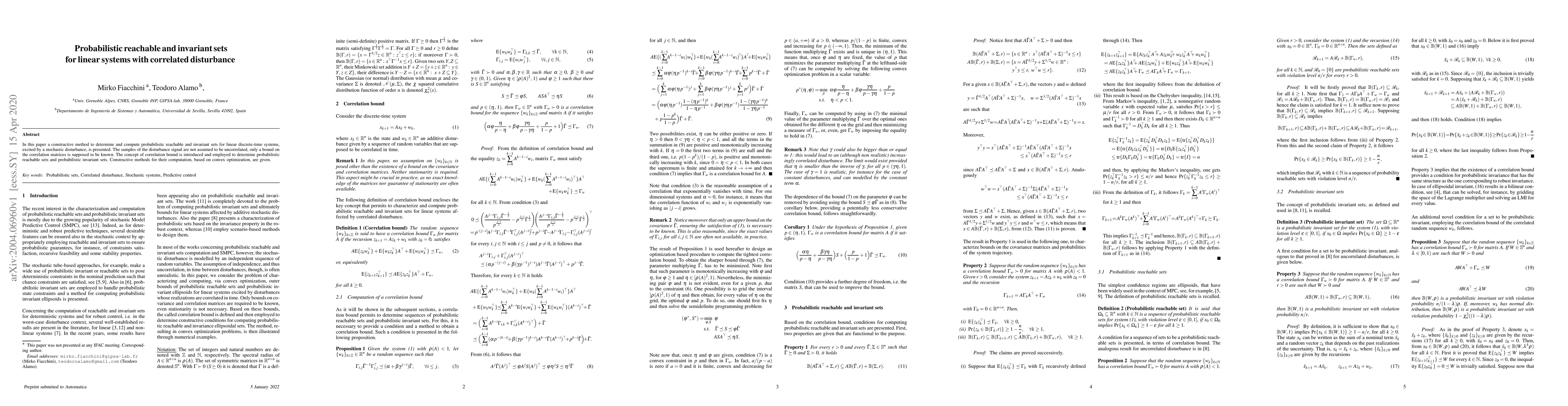 In this paper a constructive method to determine and compute probabilistic reachable and invariant sets for linear discrete-time systems, excited by a stochastic disturbance, is presented. The samples of the disturbance signal are not assumed to be uncorrelated, only a bound on the correlation matrices is supposed to be known. The concept of correlation bound is introduced and employed to determine probabilistic reachable sets and probabilistic invariant sets. Constructive methods for their computation, based on convex optimization, are given.
