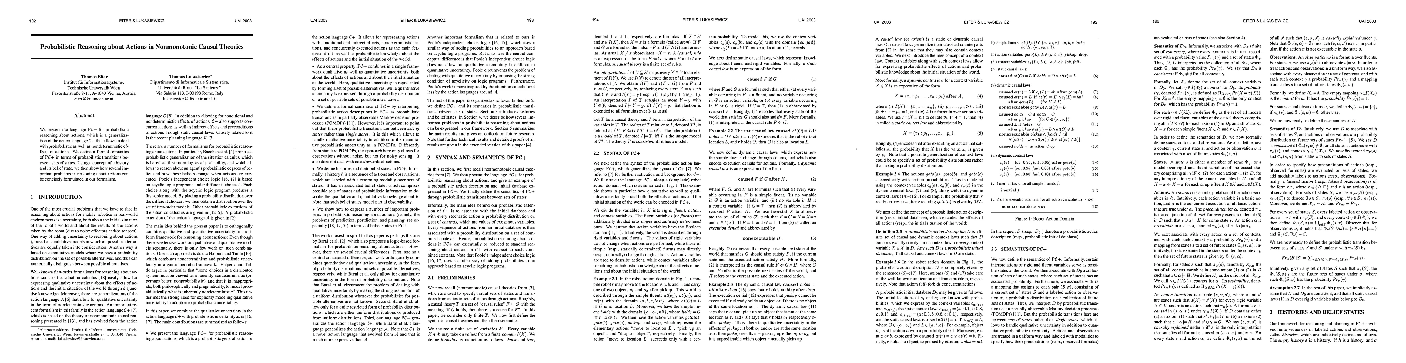 This paper introduces a language {m P}{cal C}+ for probabilistic reasoning about actions, extending {cal C}+ to handle probabilistic and nondeterministic effects. It defines a formal semantics based on probabilistic transitions and demonstrates how to formulate key problems in action reasoning within this framework.