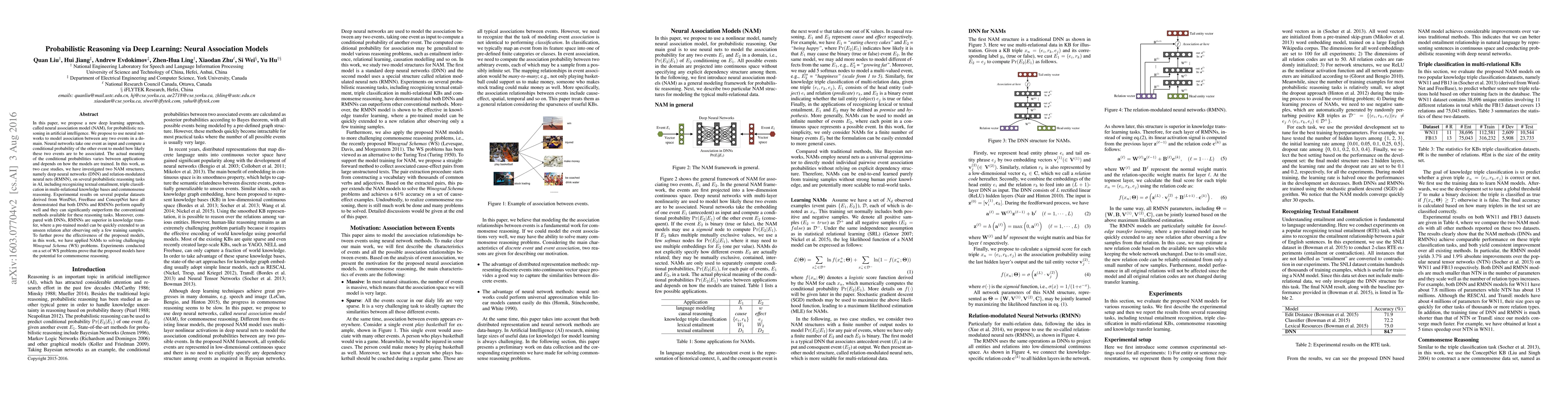This paper introduces a neural association model (NAM) for probabilistic reasoning in AI, employing neural networks to model the association between events. Experiments show that deep neural networks (DNN) and relation-modulated neural nets (RMNN) outperform conventional methods in tasks like textual entailment and commonsense reasoning, with RMNNs excelling in knowledge transfer and solving Winograd Schema problems.