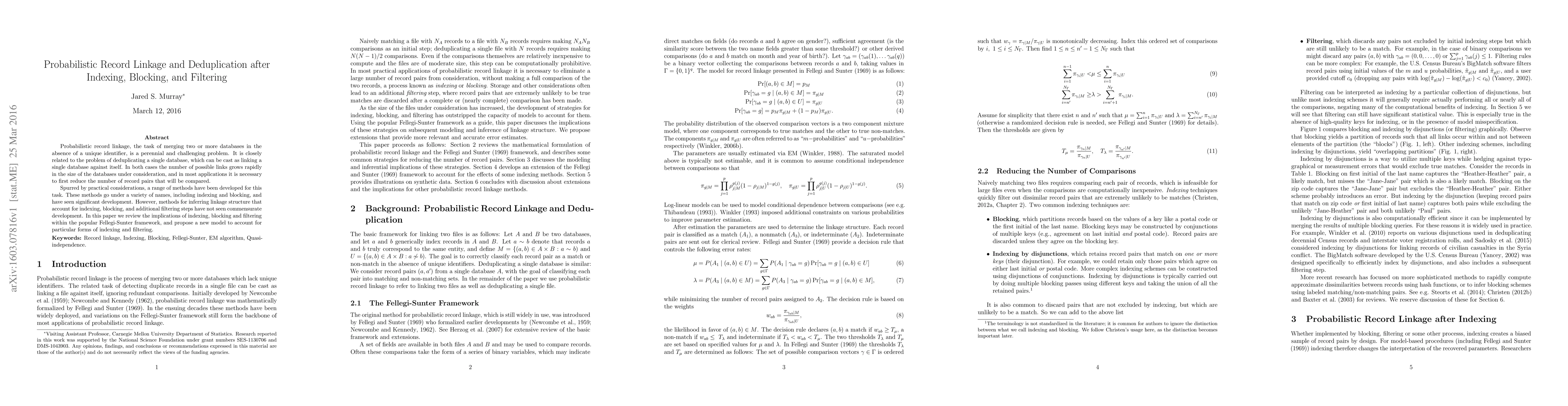 This paper reviews probabilistic record linkage and deduplication methods, emphasizing the implications of indexing, blocking, and filtering within the Fellegi-Sunter framework. It proposes a new model to better account for these techniques, addressing the lack of development in this area.