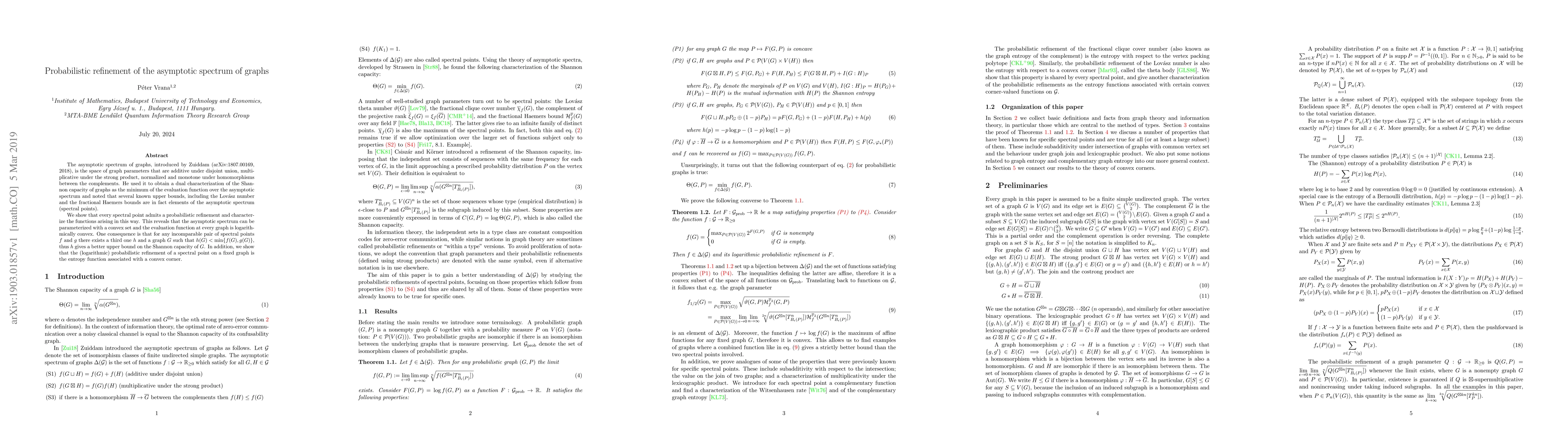 The asymptotic spectrum of graphs, introduced by Zuiddam (arXiv:1807.00169, 2018), is the space of graph parameters that are additive under disjoint union, multiplicative under the strong product, normalized and monotone under homomorphisms between the complements. He used it to obtain a dual characterization of the Shannon capacity of graphs as the minimum of the evaluation function over the asymptotic spectrum and noted that several known upper bounds, including the Lov\'asz number and the fractional Haemers bounds are in fact elements of the asymptotic spectrum (spectral points). We show that every spectral point admits a probabilistic refinement and characterize the functions arising in this way. This reveals that the asymptotic spectrum can be parameterized with a convex set and the evaluation function at every graph is logarithmically convex. One consequence is that for any incomparable pair of spectral points $f$ and $g$ there exists a third one $h$ and a graph $G$ such that $h(G)<\min\{f(G),g(G)\}$, thus $h$ gives a better upper bound on the Shannon capacity of $G$. In addition, we show that the (logarithmic) probabilistic refinement of a spectral point on a fixed graph is the entropy function associated with a convex corner.