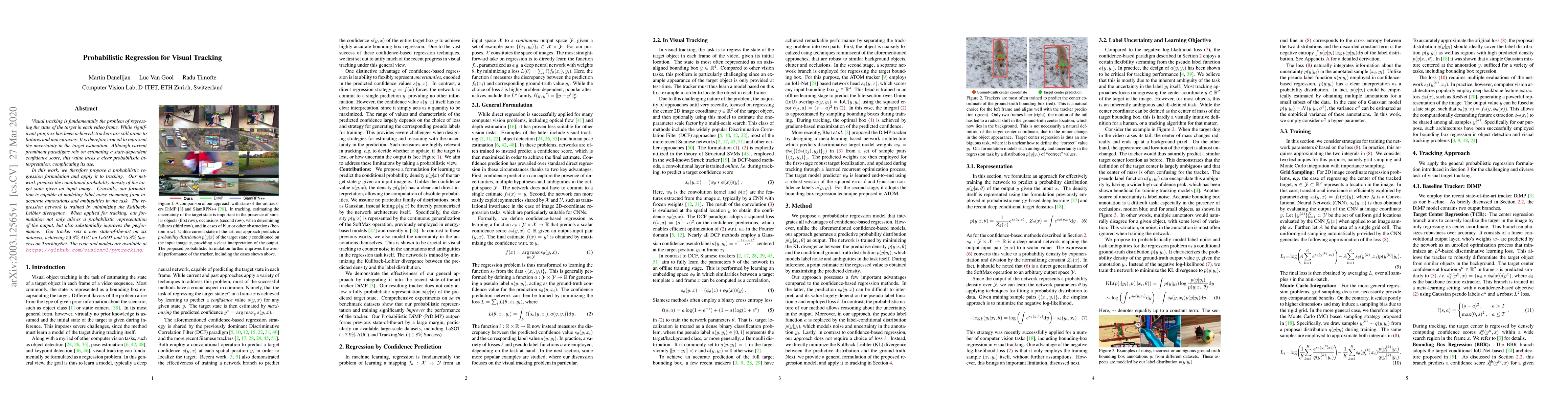 This paper introduces a probabilistic regression approach to visual tracking, which predicts the conditional probability density of target states given input images and improves performance on several datasets.