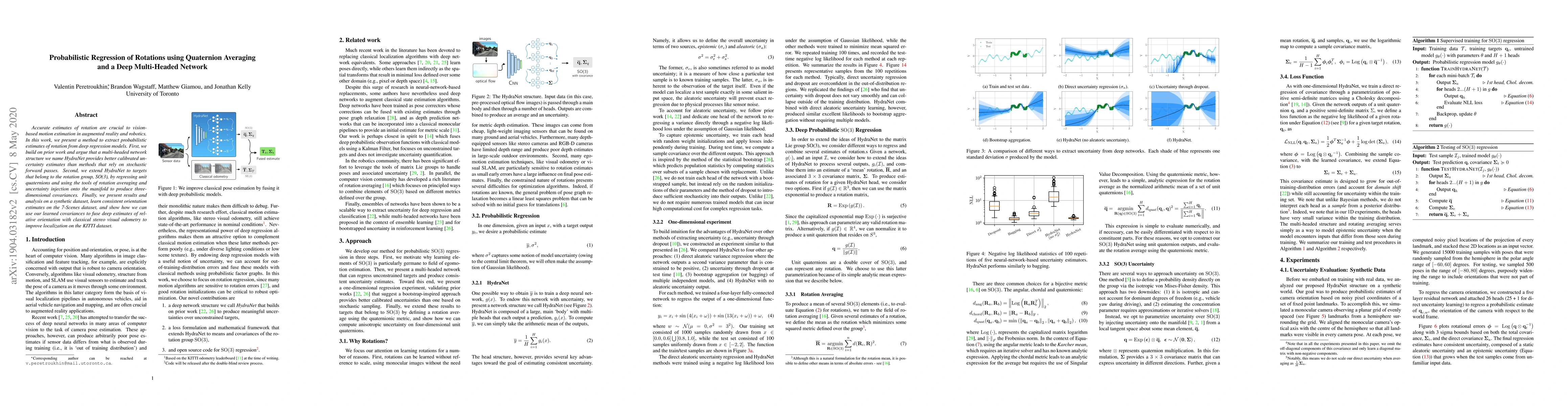 Accurate estimates of rotation are crucial to vision-based motion estimation in augmented reality and robotics. In this work, we present a method to extract probabilistic estimates of rotation from deep regression models. First, we build on prior work and argue that a multi-headed network structure we name HydraNet provides better calibrated uncertainty estimates than methods that rely on stochastic forward passes. Second, we extend HydraNet to targets that belong to the rotation group, SO(3), by regressing unit quaternions and using the tools of rotation averaging and uncertainty injection onto the manifold to produce three-dimensional covariances. Finally, we present results and analysis on a synthetic dataset, learn consistent orientation estimates on the 7-Scenes dataset, and show how we can use our learned covariances to fuse deep estimates of relative orientation with classical stereo visual odometry to improve localization on the KITTI dataset.