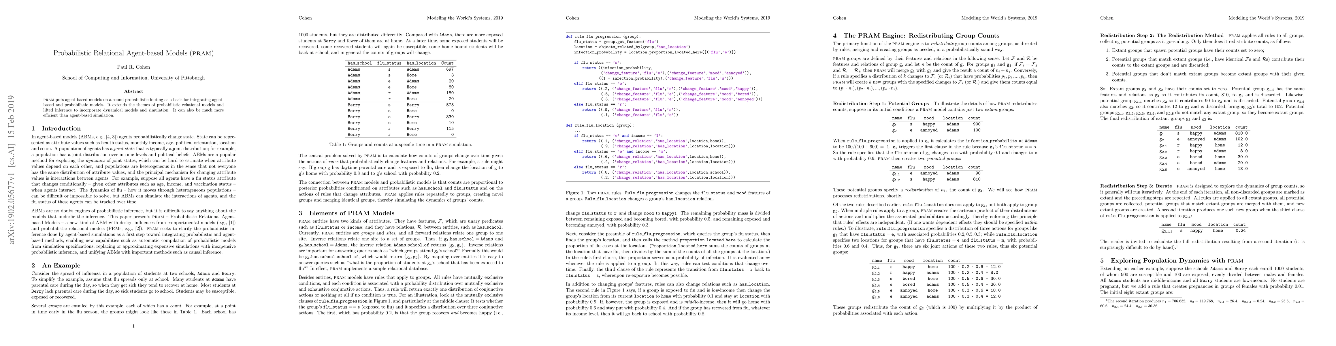 Summary: Probabilistic Relational Agent-based Models (PRAM) provide a probabilistic framework for integrating agent-based and probabilistic models, enhancing efficiency and extending probabilistic relational models to dynamic simulations. This approach offers a more robust foundation for agent-based simulations compared to traditional methods.