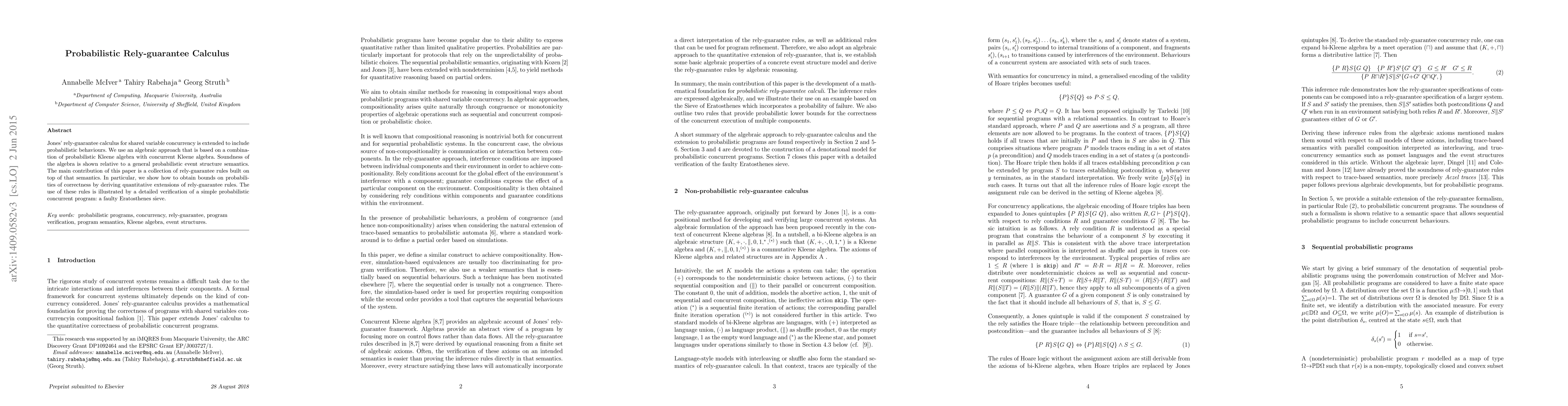 This paper extends Jones' rely-guarantee calculus to incorporate probabilistic behaviors using an algebraic approach combining probabilistic and concurrent Kleene algebras. It establishes soundness relative to probabilistic event structure semantics and introduces rely-guarantee rules to derive probability bounds, illustrated through the verification of a probabilistic concurrent program.