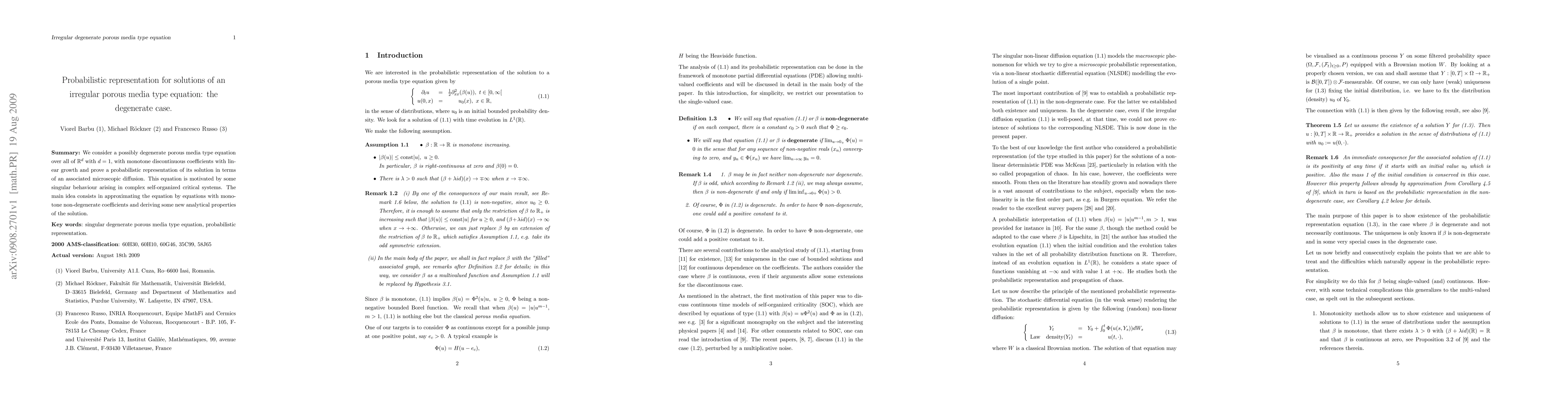 We consider a possibly degenerate porous media type equation over all of $\R^d$ with $d = 1$, with monotone discontinuous coefficients with linear growth and prove a probabilistic representation of its solution in terms of an associated microscopic diffusion. This equation is motivated by some singular behaviour arising in complex self-organized critical systems. The main idea consists in approximating the equation by equations with monotone non-degenerate coefficients and deriving some new analytical properties of the solution.