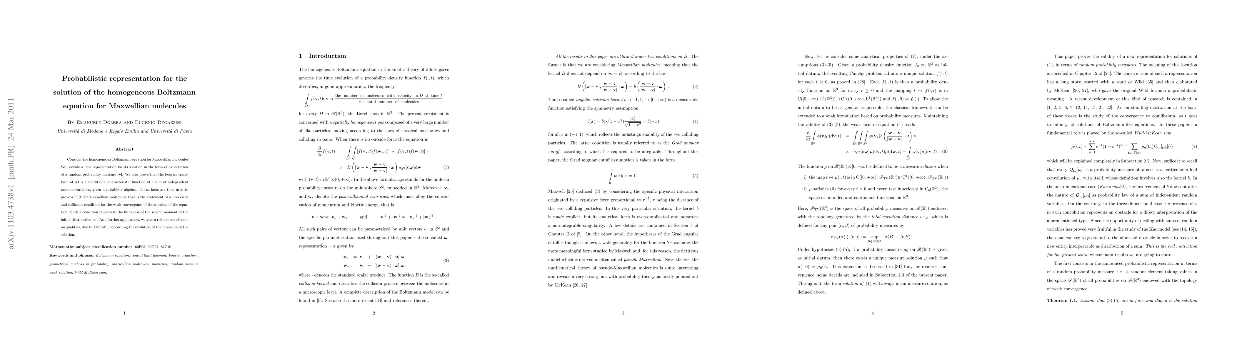 This paper introduces a probabilistic representation for the solution of the homogeneous Boltzmann equation for Maxwellian molecules, showing that its Fourier transform is a conditional characteristic function. It proves a Central Limit Theorem for Maxwellian molecules, establishing a necessary and sufficient condition for weak convergence based on the finiteness of the second moment of the initial distribution.