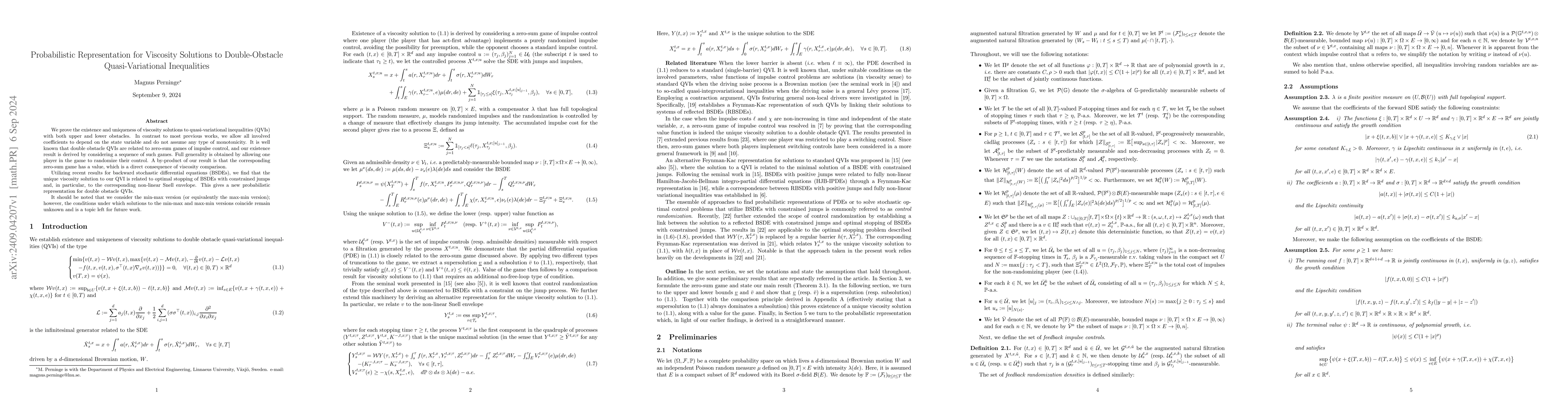 The paper establishes a probabilistic representation for viscosity solutions to double-obstacle QVIs using BSDEs and viscosity comparison, contributing to the theory of stochastic control and viscosity solutions.