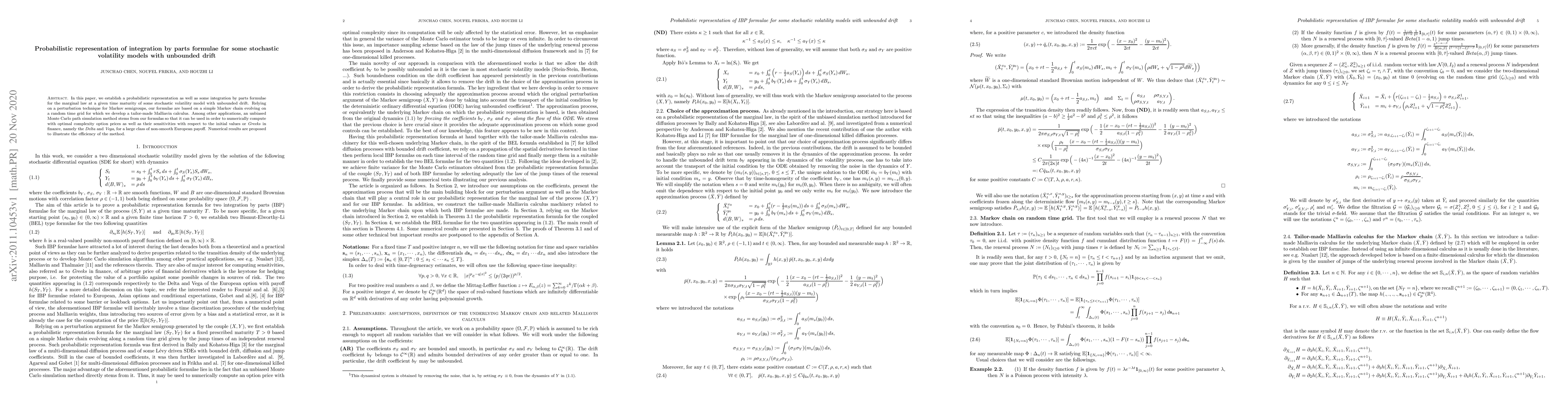 In this paper, we establish a probabilistic representation as well as some integration by parts formulae for the marginal law at a given time maturity of some stochastic volatility model with unbounded drift. Relying on a perturbation technique for Markov semigroups, our formulae are based on a simple Markov chain evolving on a random time grid for which we develop a tailor-made Malliavin calculus. Among other applications, an unbiased Monte Carlo path simulation method stems from our formulas so that it can be used in order to numerically compute with optimal complexity option prices as well as their sensitivities with respect to the initial values or Greeks in finance, namely the Delta and Vega, for a large class of non-smooth European payoff. Numerical results are proposed to illustrate the efficiency of the method.