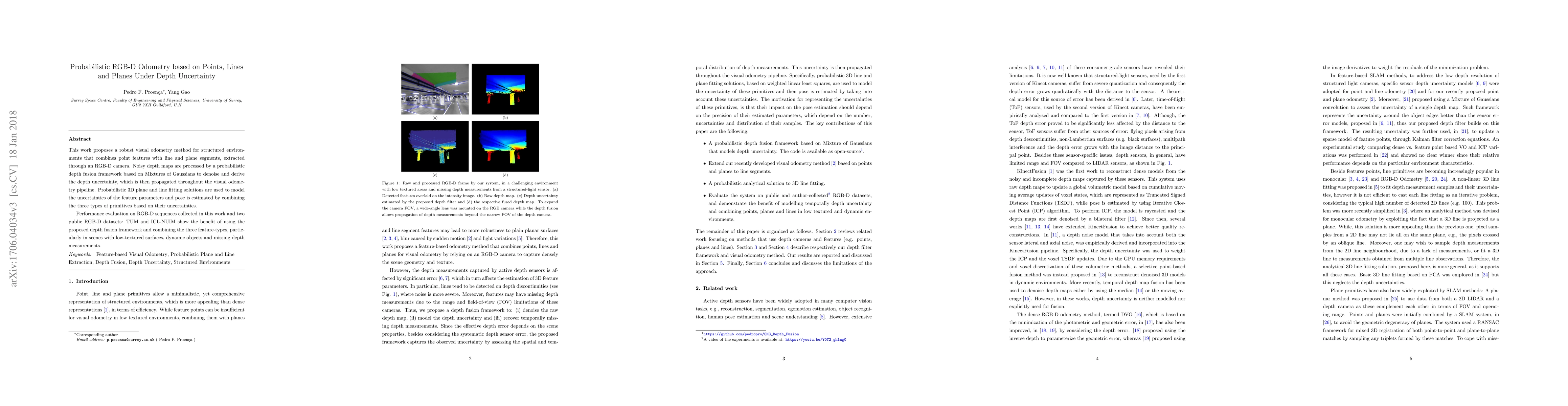 This paper proposes a robust visual odometry method for structured environments using an RGB-D camera, combining point features with line and plane segments. It introduces a probabilistic depth fusion framework based on Mixtures of Gaussians to denoise depth maps and derive depth uncertainty, which is then propagated throughout the odometry pipeline. The paper uses probabilistic 3D plane and line fitting solutions to model feature parameter uncertainties and estimates pose by combining the three types of primitives based on their uncertainties.