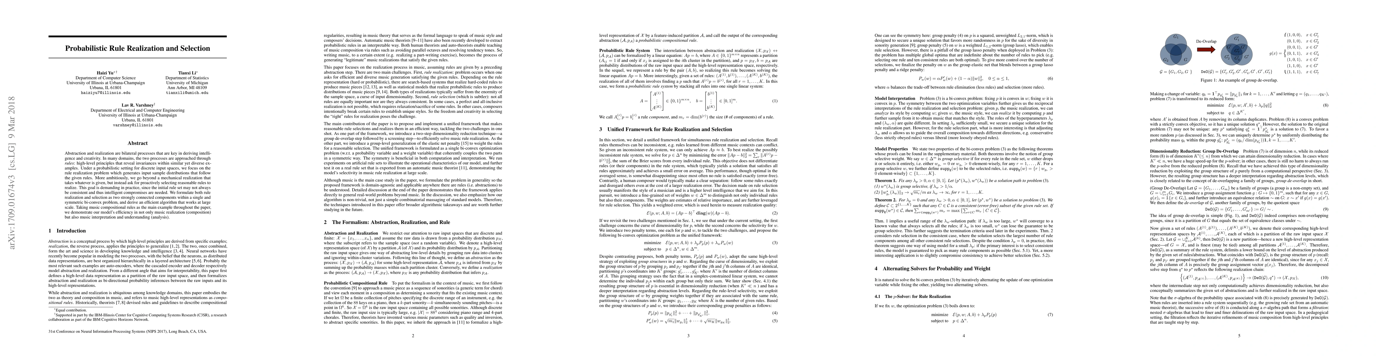 Abstraction and realization are bilateral processes that are key in deriving intelligence and creativity. In many domains, the two processes are approached through rules: high-level principles that reveal invariances within similar yet diverse examples. Under a probabilistic setting for discrete input spaces, we focus on the rule realization problem which generates input sample distributions that follow the given rules. More ambitiously, we go beyond a mechanical realization that takes whatever is given, but instead ask for proactively selecting reasonable rules to realize. This goal is demanding in practice, since the initial rule set may not always be consistent and thus intelligent compromises are needed. We formulate both rule realization and selection as two strongly connected components within a single and symmetric bi-convex problem, and derive an efficient algorithm that works at large scale. Taking music compositional rules as the main example throughout the paper, we demonstrate our model's efficiency in not only music realization (composition) but also music interpretation and understanding (analysis).