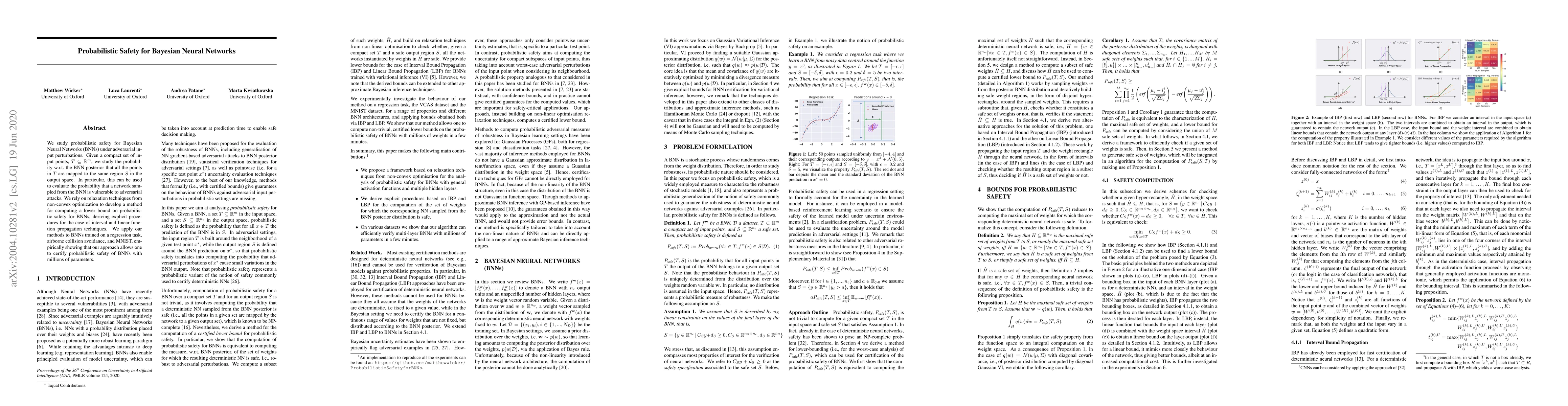 This paper develops a method to evaluate the probability that a Bayesian Neural Network is vulnerable to adversarial attacks, enabling certification of its probabilistic safety. It applies this approach to various datasets and shows that it can certify the safety of BNNs with millions of parameters.