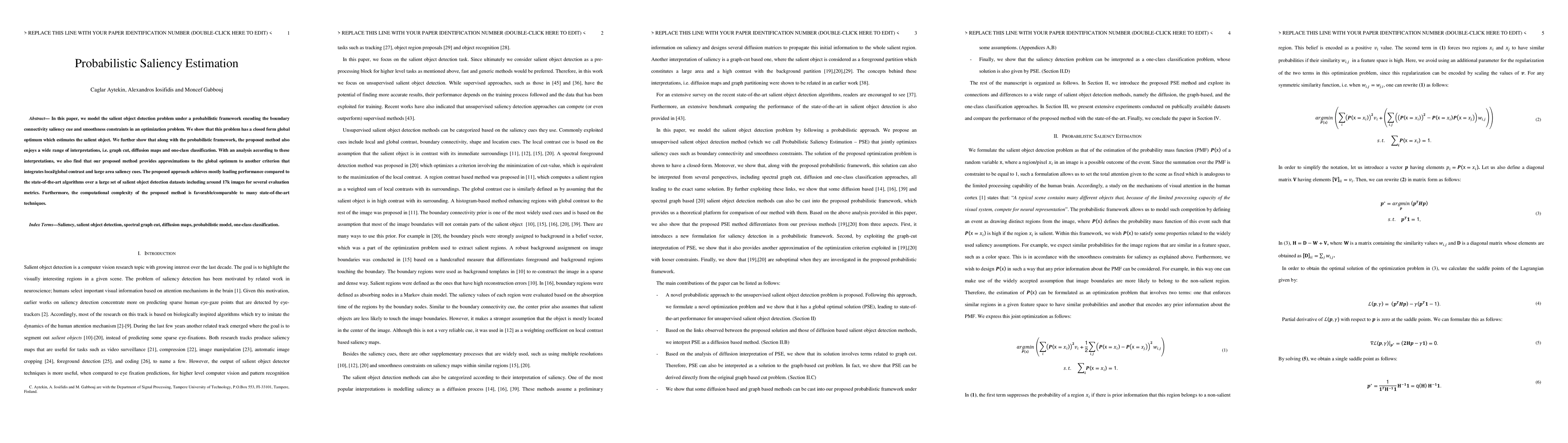 In this paper, we model the salient object detection problem under a probabilistic framework encoding the boundary connectivity saliency cue and smoothness constraints in an optimization problem. We show that this problem has a closed form global optimum which estimates the salient object. We further show that along with the probabilistic framework, the proposed method also enjoys a wide range of interpretations, i.e. graph cut, diffusion maps and one-class classification. With an analysis according to these interpretations, we also find that our proposed method provides approximations to the global optimum to another criterion that integrates local/global contrast and large area saliency cues. The proposed approach achieves mostly leading performance compared to the state-of-the-art algorithms over a large set of salient object detection datasets including around 17k images for several evaluation metrics. Furthermore, the computational complexity of the proposed method is favorable/comparable to many state-of-the-art techniques.