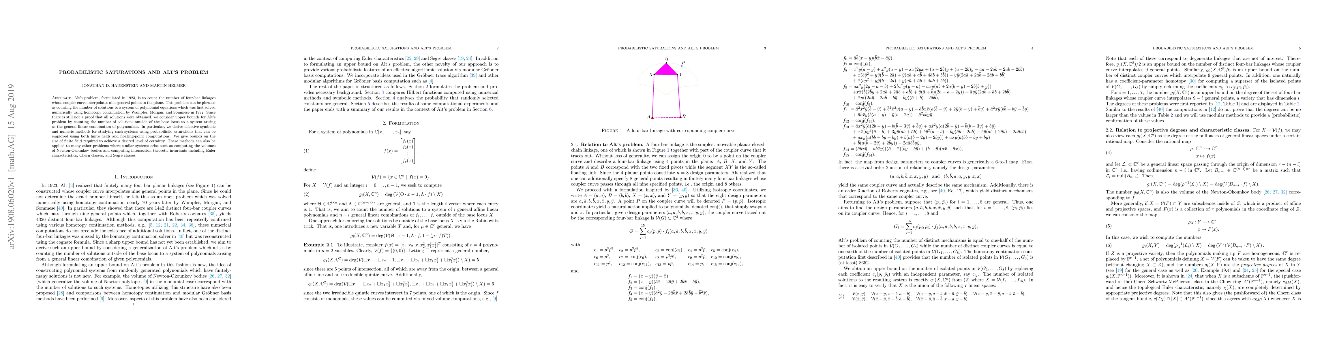 Alt's problem, formulated in 1923, is to count the number of four-bar linkages whose coupler curve interpolates nine general points in the plane. This problem can be phrased as counting the number of solutions to a system of polynomial equations which was first solved numerically using homotopy continuation by Wampler, Morgan, and Sommese in 1992. Since there is still not a proof that all solutions were obtained, we consider upper bounds for Alt's problem by counting the number of solutions outside of the base locus to a system arising as the general linear combination of polynomials. In particular, we derive effective symbolic and numeric methods for studying such systems using probabilistic saturations that can be employed using both finite fields and floating-point computations. We give bounds on the size of finite field required to achieve a desired level of certainty. These methods can also be applied to many other problems where similar systems arise such as computing the volumes of Newton-Okounkov bodies and computing intersection theoretic invariants including Euler characteristics, Chern classes, and Segre classes.