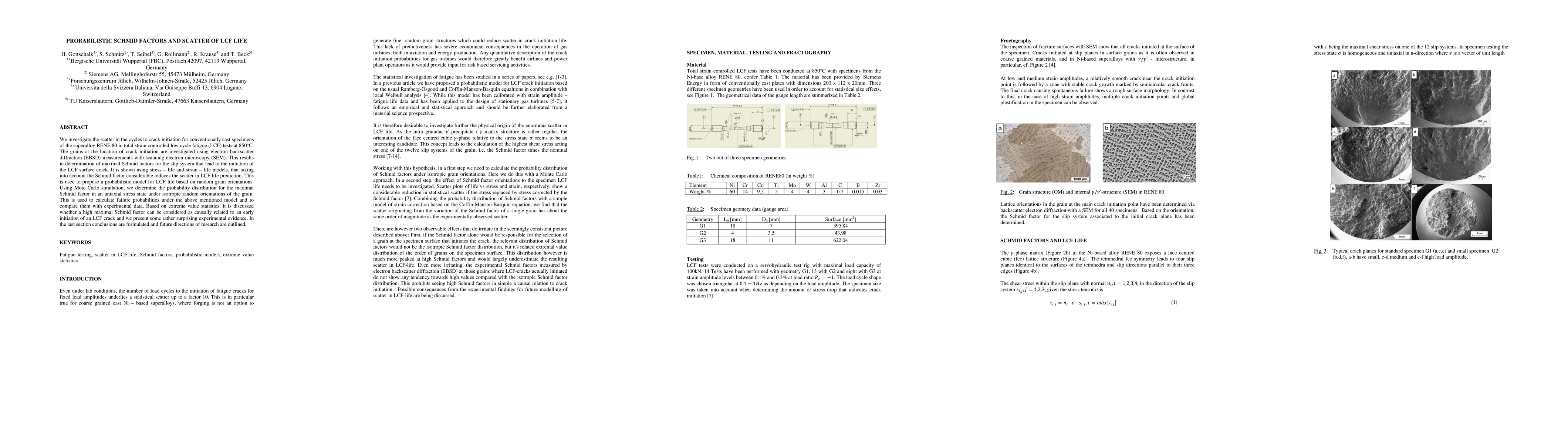 The research investigates the scatter in cycles to crack initiation for conventionally cast RENE 80 superalloy specimens in low cycle fatigue (LCF) tests at 850°C. It uses electron backscatter diffraction (EBSD) measurements with scanning electron microscopy (SEM) to determine maximal Schmid factors for the slip system leading to crack initiation. Stress-life and strain-life models are employed to show that accounting for Schmid factors significantly reduces the scatter in LCF life prediction, proposing a probabilistic model for LCF life based on random grain orientations.
