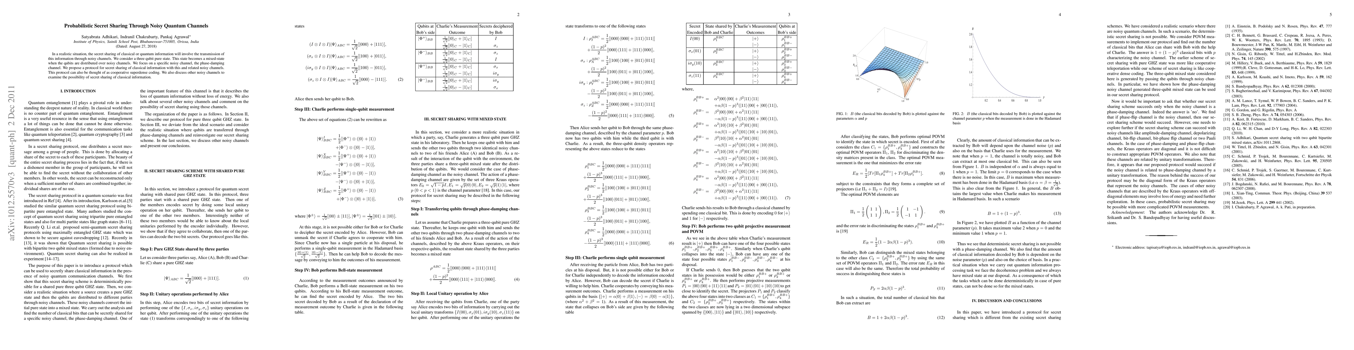The paper presents a protocol for probabilistic secret sharing through noisy quantum channels, utilizing cooperative quantum information processing techniques and providing a detailed analysis for the phase-damping channel.