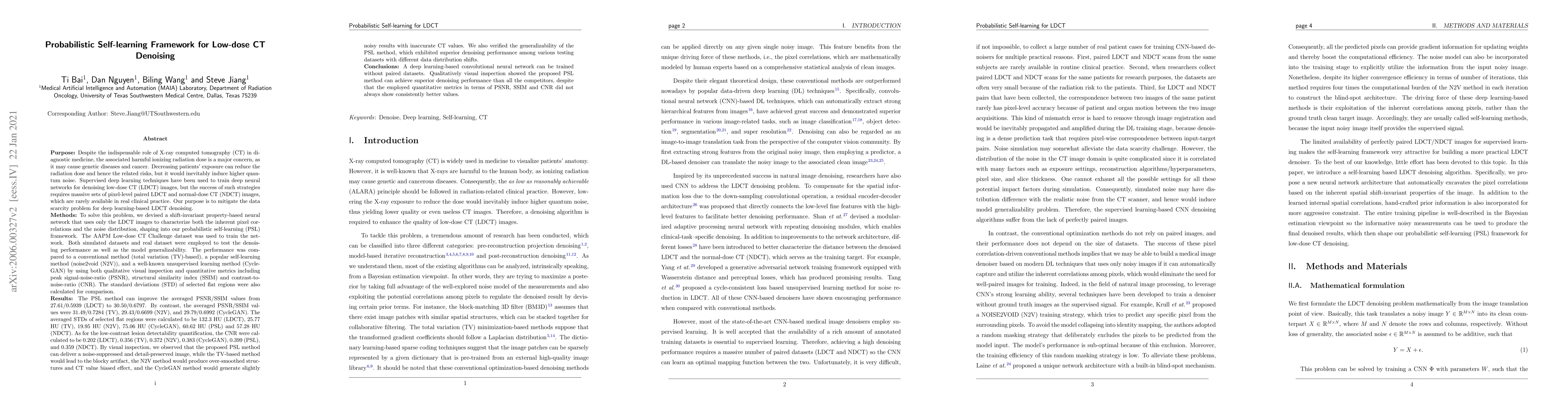 Despite the indispensable role of X-ray computed tomography (CT) in diagnostic medicine field, the associated ionizing radiation is still a major concern considering that it may cause genetic and cancerous diseases. Decreasing the exposure can reduce the dose and hence the radiation-related risk, but will also induce higher quantum noise. Supervised deep learning can be used to train a neural network to denoise the low-dose CT (LDCT). However, its success requires massive pixel-wise paired LDCT and normal-dose CT (NDCT) images, which are rarely available in real practice. To alleviate this problem, in this paper, a shift-invariant property based neural network was devised to learn the inherent pixel correlations and also the noise distribution by only using the LDCT images, shaping into our probabilistic self-learning framework. Experimental results demonstrated that the proposed method outperformed the competitors, producing an enhanced LDCT image that has similar image style as the routine NDCT which is highly-preferable in clinic practice.