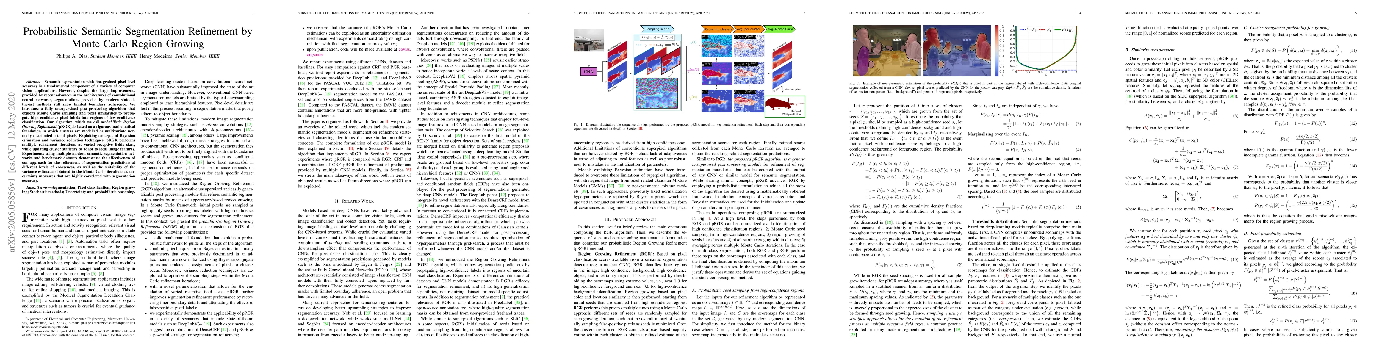 This paper proposes a probabilistic refinement method called pRGR that uses Monte Carlo sampling and region growing for improving the accuracy of semantic segmentation. The pRGR algorithm enhances low-confidence regions by propagating high-confidence labels, demonstrating improved boundary adherence and effective uncertainty measures.
