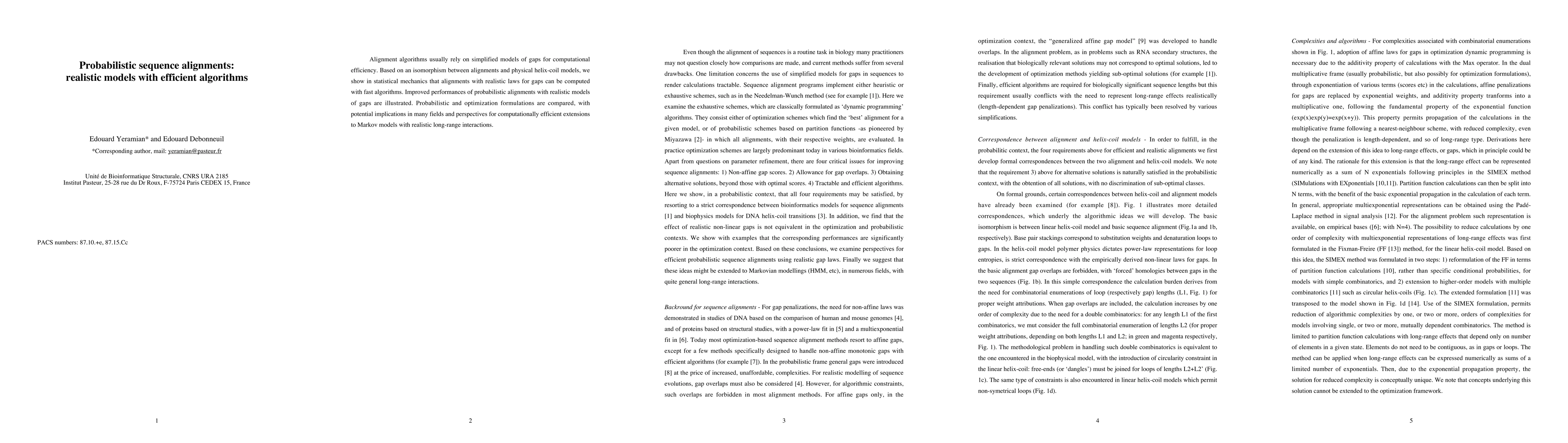 This paper develops efficient algorithms for probabilistic sequence alignments using realistic gap models inspired by physical helix-coil models. It demonstrates improved alignment performance and compares probabilistic and optimization formulations, with potential applications across various fields and extensions to Markov models.