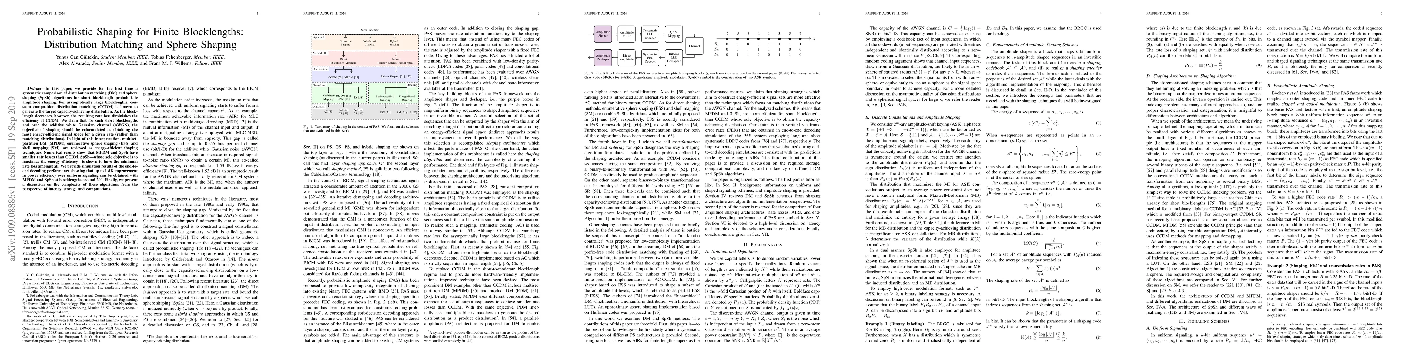 This paper compares distribution matching and sphere shaping algorithms for short blocklength probabilistic amplitude shaping, finding that sphere shaping achieves the most energy-efficient signal space and thus the lowest rate loss over the AWGN channel. Simulation results show up to 1 dB power efficiency improvement with these methods over uniform signaling.