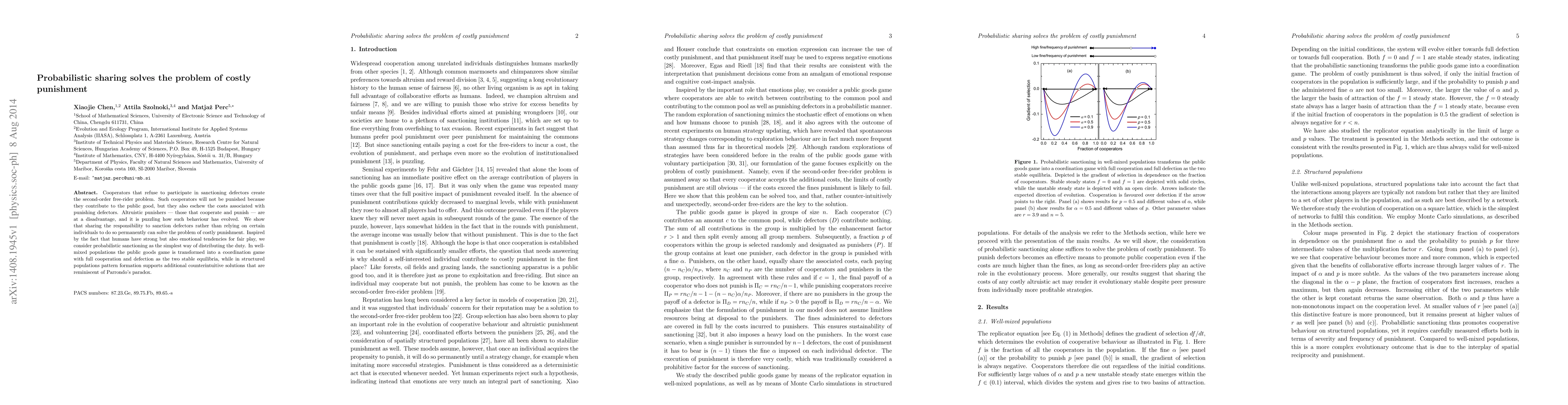 Cooperators that refuse to participate in sanctioning defectors create the second-order free-rider problem. Such cooperators will not be punished because they contribute to the public good, but they also eschew the costs associated with punishing defectors. Altruistic punishers - those that cooperate and punish - are at a disadvantage, and it is puzzling how such behaviour has evolved. We show that sharing the responsibility to sanction defectors rather than relying on certain individuals to do so permanently can solve the problem of costly punishment. Inspired by the fact that humans have strong but also emotional tendencies for fair play, we consider probabilistic sanctioning as the simplest way of distributing the duty. In well-mixed populations the public goods game is transformed into a coordination game with full cooperation and defection as the two stable equilibria, while in structured populations pattern formation supports additional counterintuitive solutions that are reminiscent of Parrondo's paradox.