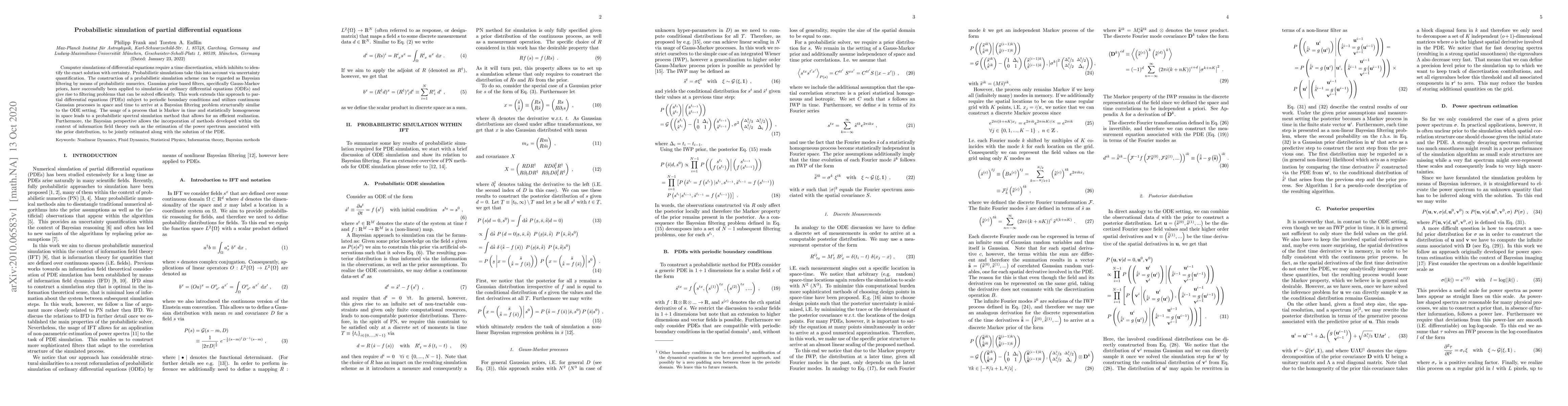 Computer simulations of differential equations require a time discretization, which inhibits to identify the exact solution with certainty. Probabilistic simulations take this into account via uncertainty quantification. The construction of a probabilistic simulation scheme can be regarded as Bayesian filtering by means of probabilistic numerics. Gaussian prior based filters, specifically Gauss-Markov priors, have successfully been applied to simulation of ordinary differential equations (ODEs) and give rise to filtering problems that can be solved efficiently. This work extends this approach to partial differential equations (PDEs) subject to periodic boundary conditions and utilizes continuous Gaussian processes in space and time to arrive at a Bayesian filtering problem structurally similar to the ODE setting. The usage of a process that is Markov in time and statistically homogeneous in space leads to a probabilistic spectral simulation method that allows for an efficient realization. Furthermore, the Bayesian perspective allows the incorporation of methods developed within the context of information field theory such as the estimation of the power spectrum associated with the prior distribution, to be jointly estimated along with the solution of the PDE.