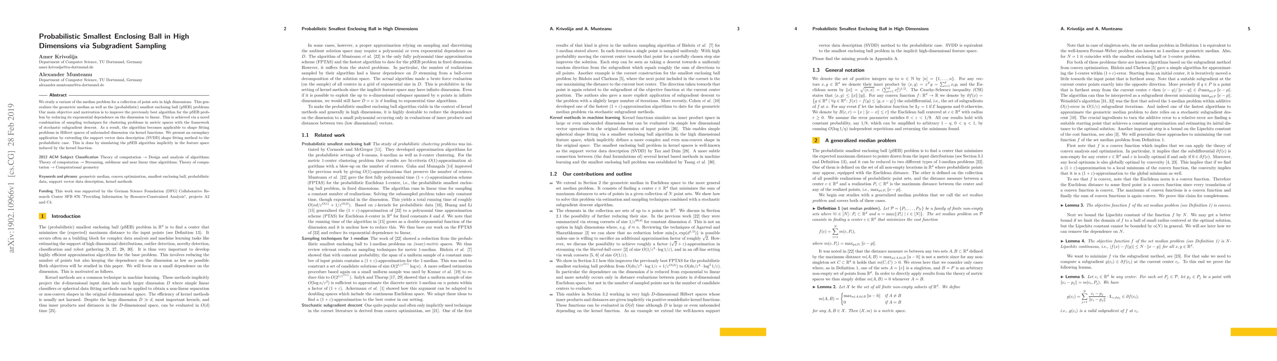 We study a variant of the median problem for a collection of point sets in high dimensions. This generalizes the geometric median as well as the (probabilistic) smallest enclosing ball (pSEB) problems. Our main objective and motivation is to improve the previously best algorithm for the pSEB problem by reducing its exponential dependence on the dimension to linear. This is achieved via a novel combination of sampling techniques for clustering problems in metric spaces with the framework of stochastic subgradient descent. As a result, the algorithm becomes applicable to shape fitting problems in Hilbert spaces of unbounded dimension via kernel functions. We present an exemplary application by extending the support vector data description (SVDD) shape fitting method to the probabilistic case. This is done by simulating the pSEB algorithm implicitly in the feature space induced by the kernel function.