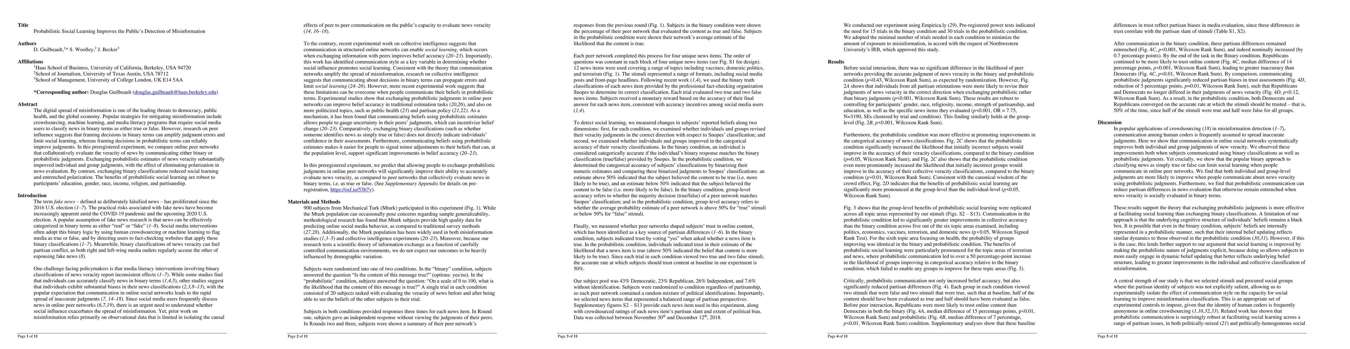 This study finds that probabilistic social learning, where individuals exchange probabilistic estimates of news veracity, significantly improves the public's ability to detect misinformation compared to binary classifications, which exacerbate polarization. The benefits of probabilistic social learning are consistent across diverse demographic groups.