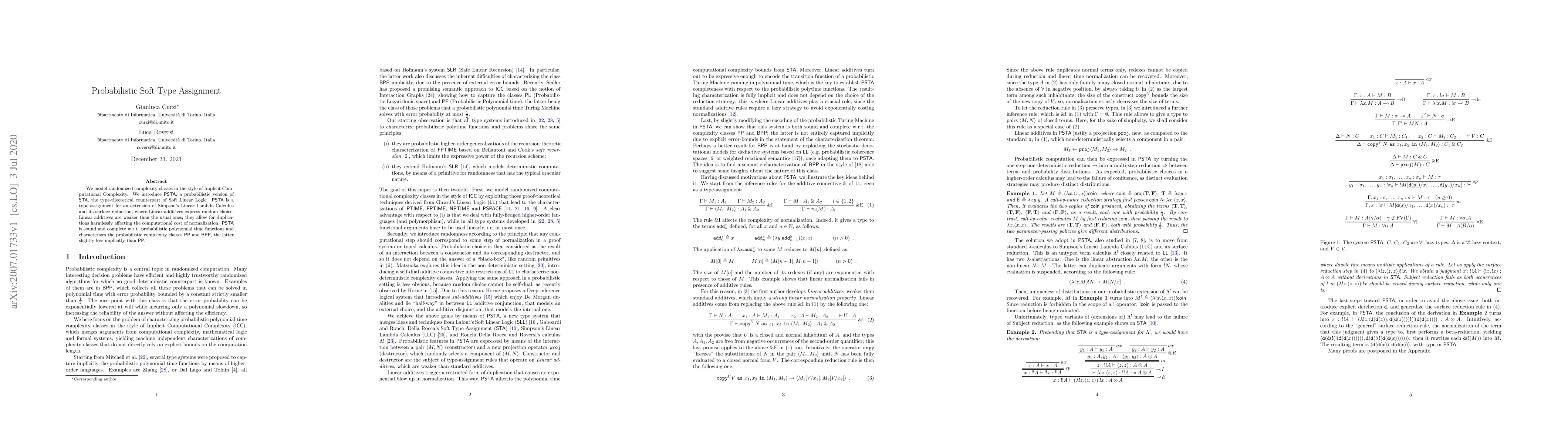 We model randomized complexity classes in the style of Implicit Computational Complexity. We introduce PSTA, a probabilistic version of STA, the type-theoretical counterpart of Soft Linear Logic. PSTA is a type assignment for an extension of Simpson's Linear Lambda Calculus and its surface reduction, where Linear additives express random choice. Linear additives are weaker than the usual ones; they allow for duplications harmlessly affecting the computational cost of normalization. PSTA is sound and complete w.r.t. probabilistic polynomial time functions and characterizes the probabilistic complexity classes PP and BPP, the latter slightly less implicitly than PP.