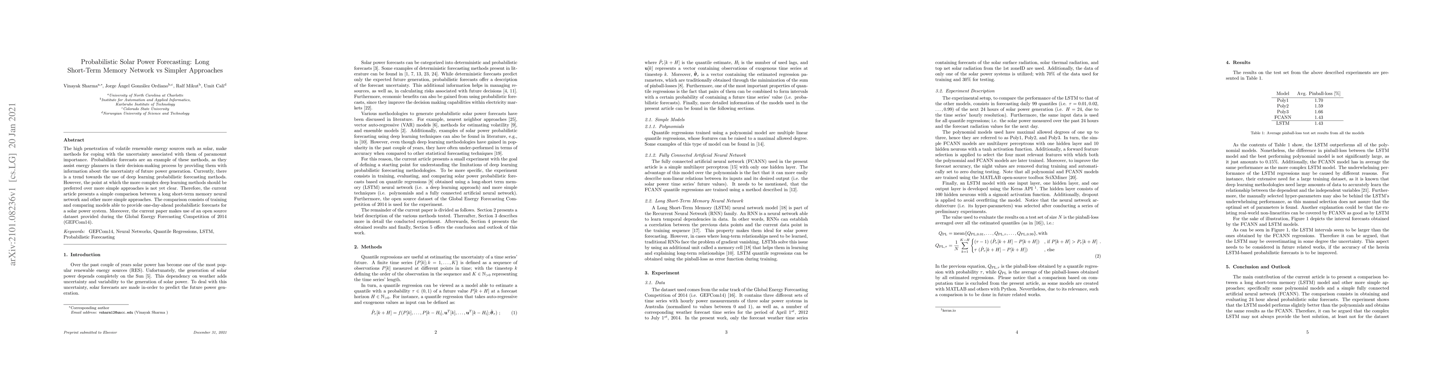 This paper compares the performance of a long short-term memory (LSTM) neural network with simpler forecasting approaches for one-day-ahead probabilistic solar power forecasts. It aims to determine when deep learning methods are preferable over simpler methods, using the GEFCom14 dataset for evaluation.