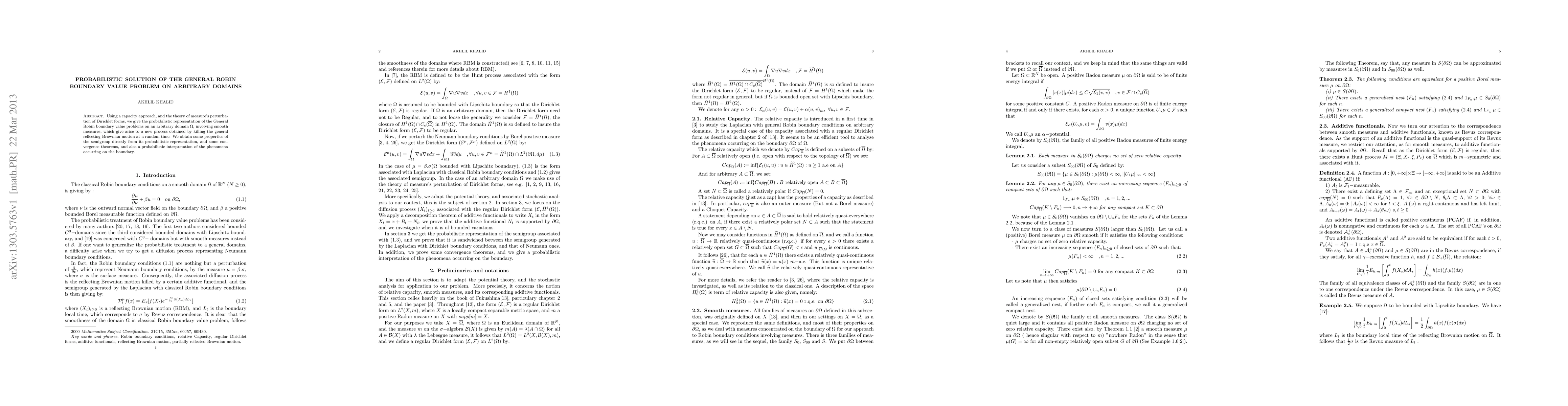 Using a capacity approach, and the theory of measure's perturbation of Dirichlet forms, we give the probabilistic representation of the General Robin boundary value problems on an arbitrary domain $\Omega$, involving smooth measures, which give arise to a new process obtained by killing the general reflecting Brownian motion at a random time. We obtain some properties of the semigroup directly from its probabilistic representation, and some convergence theorems, and also a probabilistic interpretation of the phenomena occurring on the boundary.