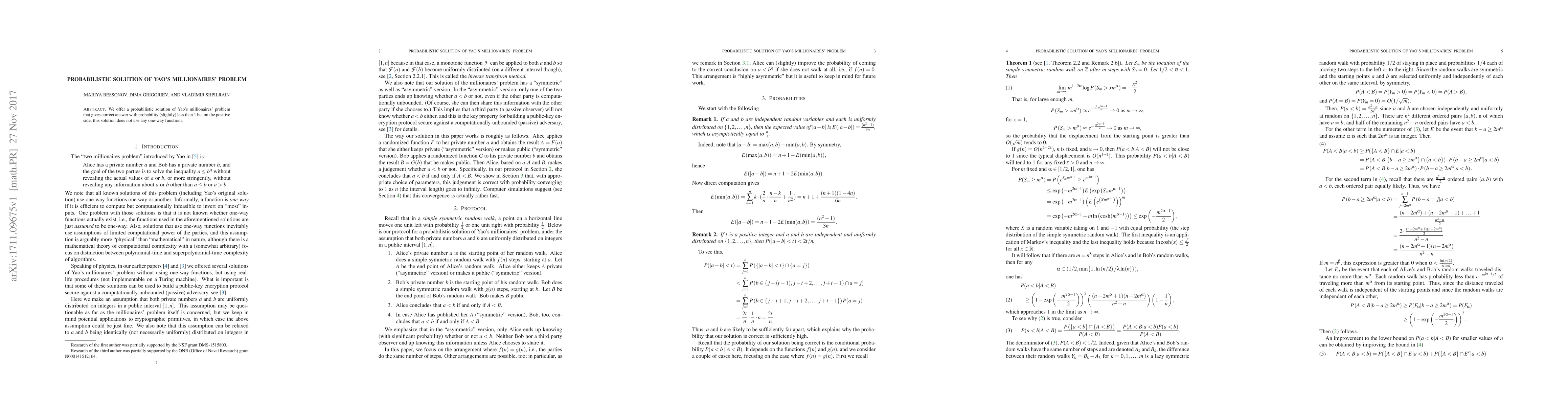 Summary: This paper presents a probabilistic solution to Yao's millionaires' problem, achieving correctness with a probability slightly less than 1, while notably avoiding the use of one-way functions.