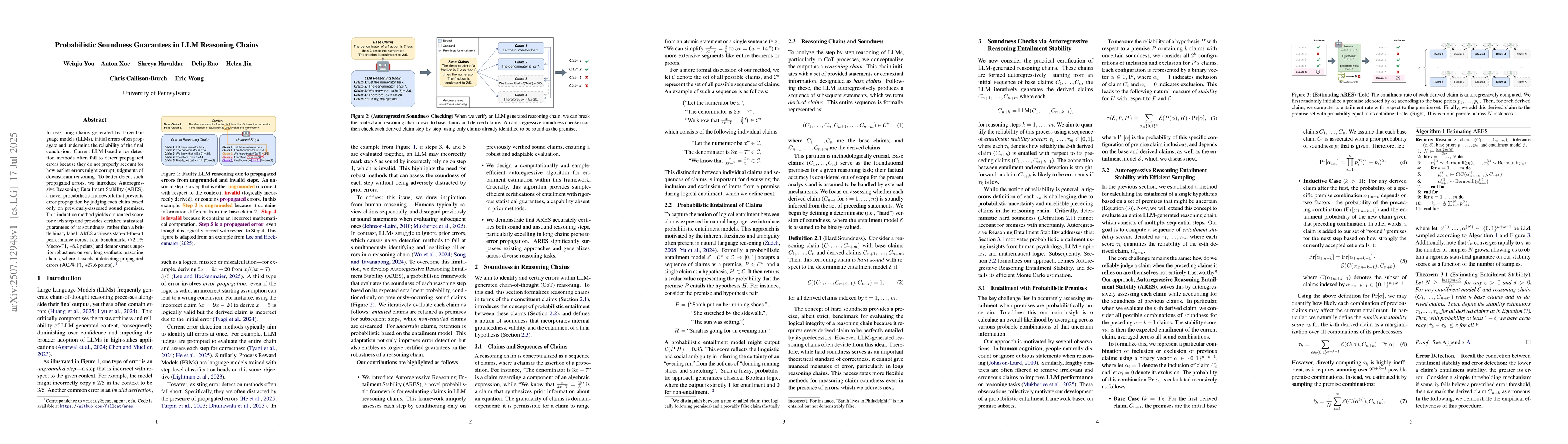 The research introduces Autoregressive Reasoning Entailment Stability (ARES), a probabilistic framework that prevents error propagation in large language models' reasoning chains. ARES provides nuanced scores and statistical soundness guarantees, outperforming existing methods with 72.1% Macro-F1 and 90.3% F1 on various benchmarks, especially in detecting errors in long reasoning chains.