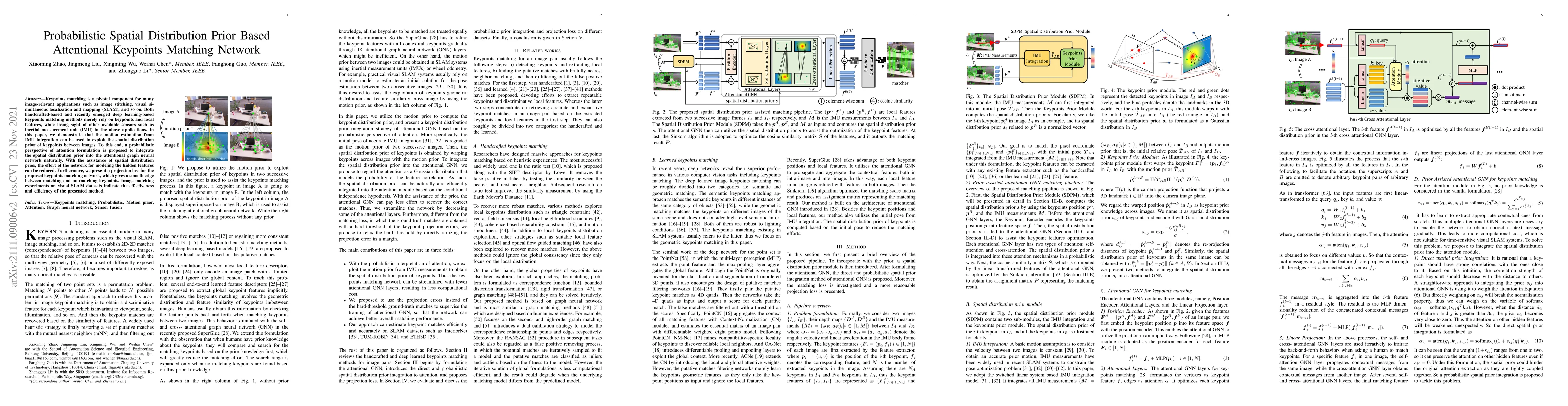 This paper proposes a probabilistic spatial distribution prior based attentional keypoints matching network that leverages motion estimation from IMU sensors to enhance keypoint matching. The method integrates spatial distribution priors into an attentional graph neural network, reducing the network's effort in modeling hidden features and introducing a projection loss for smoother keypoint matching.